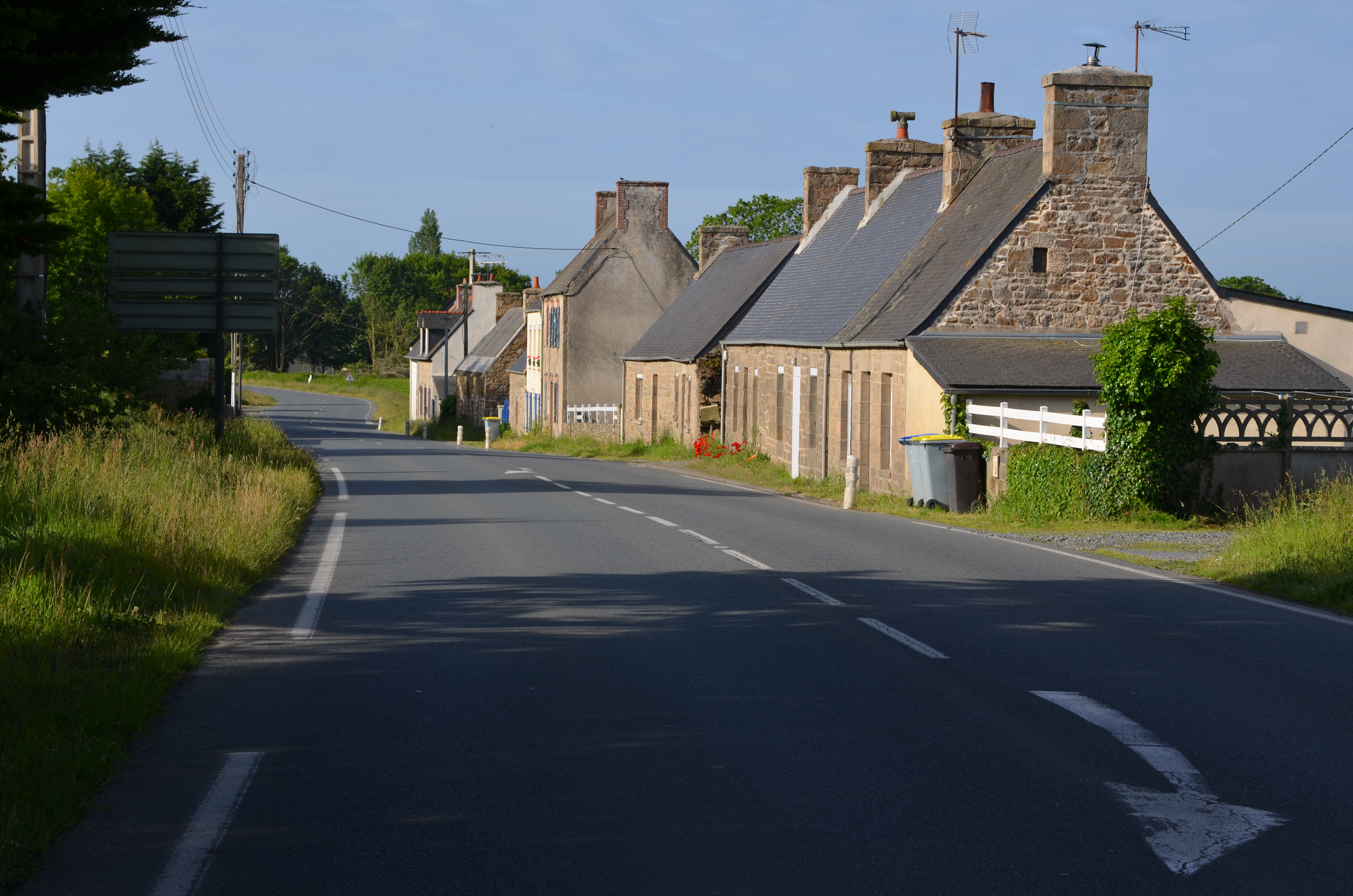 Ploubezre, Ruvignolet : alignement de huit logis à l'est de la route départementale reliant Plouaret à Lannion au nord, vue générale vers le sud. Ces logis sont datables du 19e siècle ou du début du 20e siècleImmatriculation