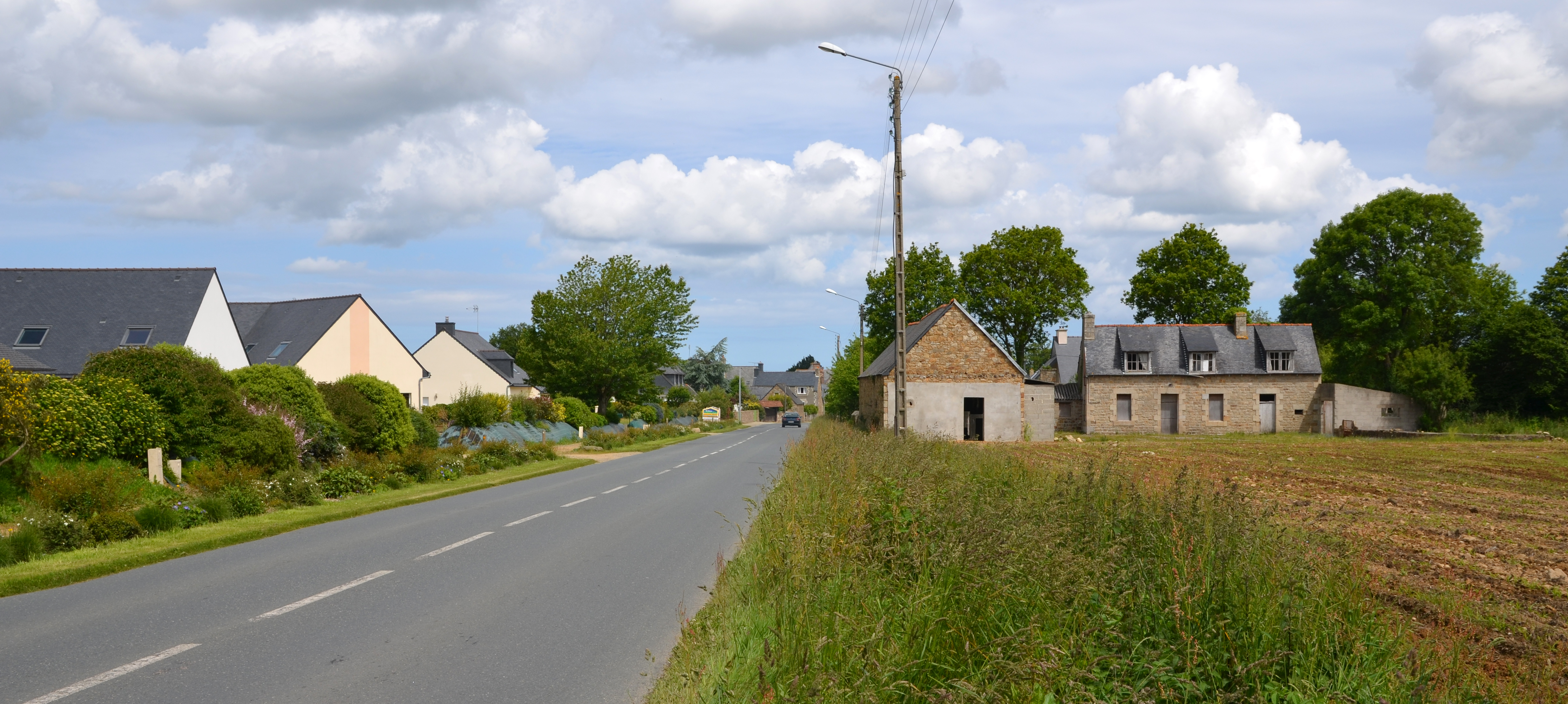 Ploubezre, rue Jean-Marie Le Foll : entrée sud du bourg. A droite : ancienne ferme, à gauche : lotissements récentsImmatriculation