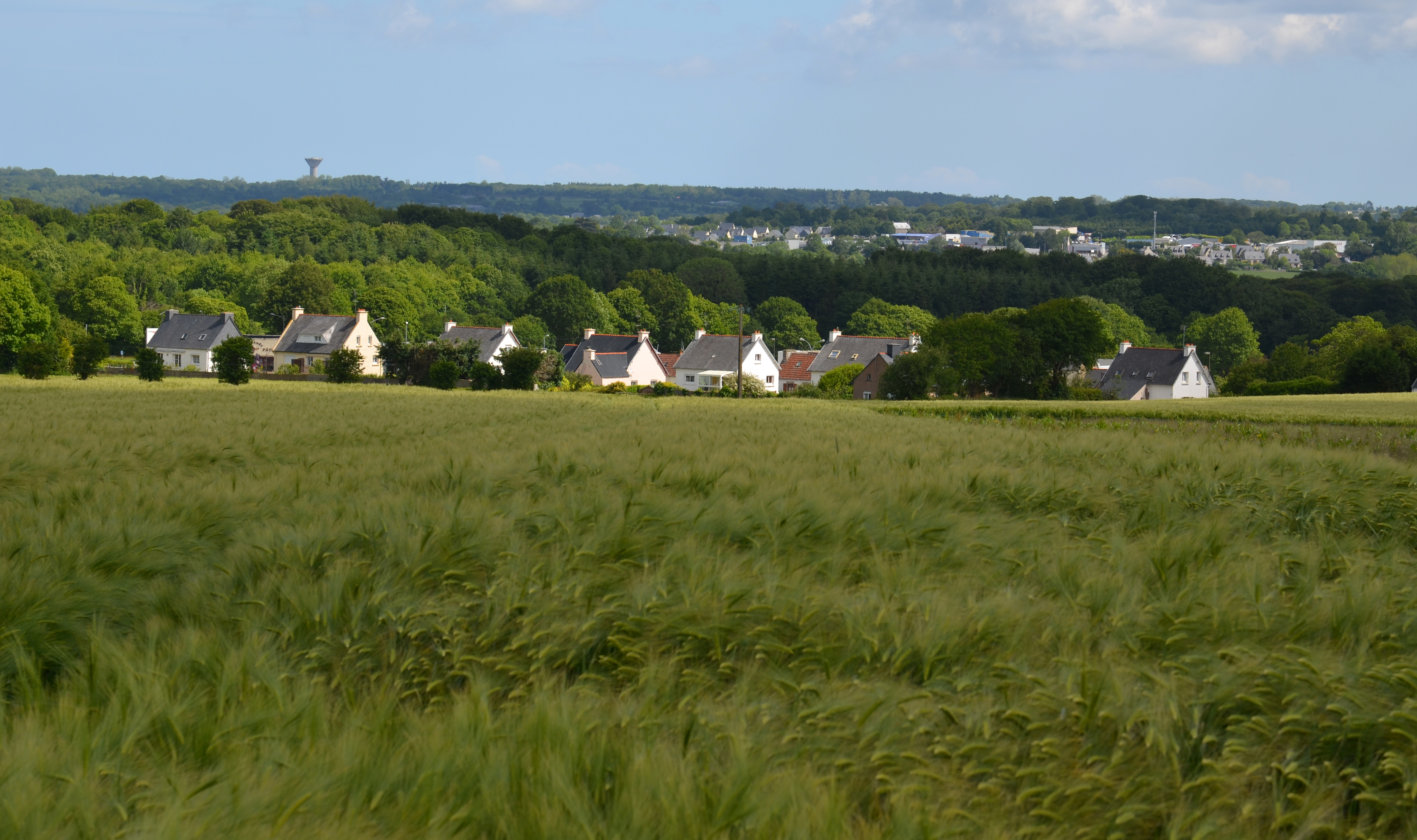 Ploubezre : vue de situation des maisons et commerces (nouvelle pharmacie et boulangerie de Ploubezre) situés le long de la départementale n° 11 depuis les environs de KeranglasImmatriculation