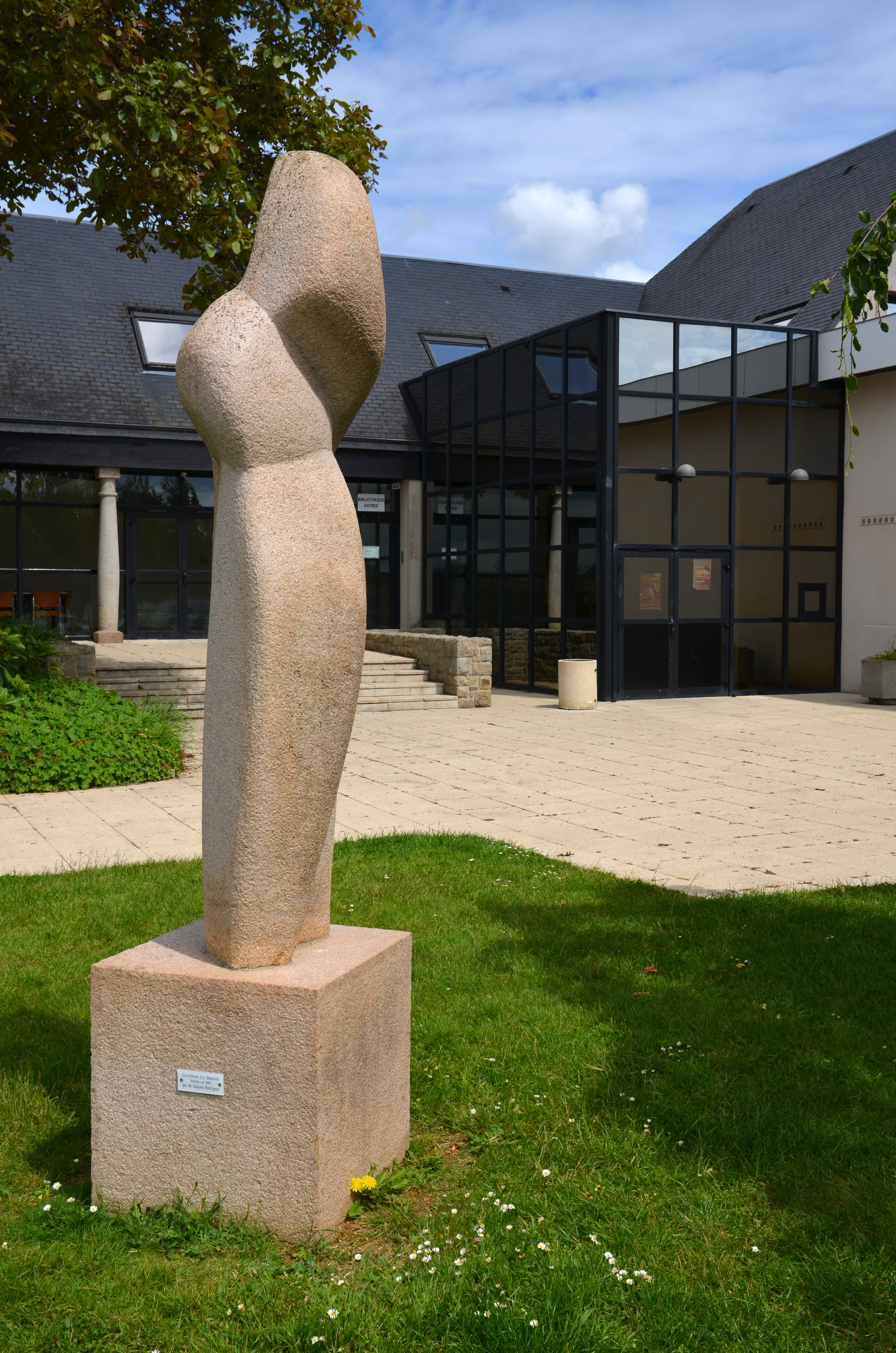Ploubezre, rue du Stade : salle polyvanete Le Carec, statue de Jacques Rodrigues (1993) sur un bloc de granite des Carrières Le DantecImmatriculation