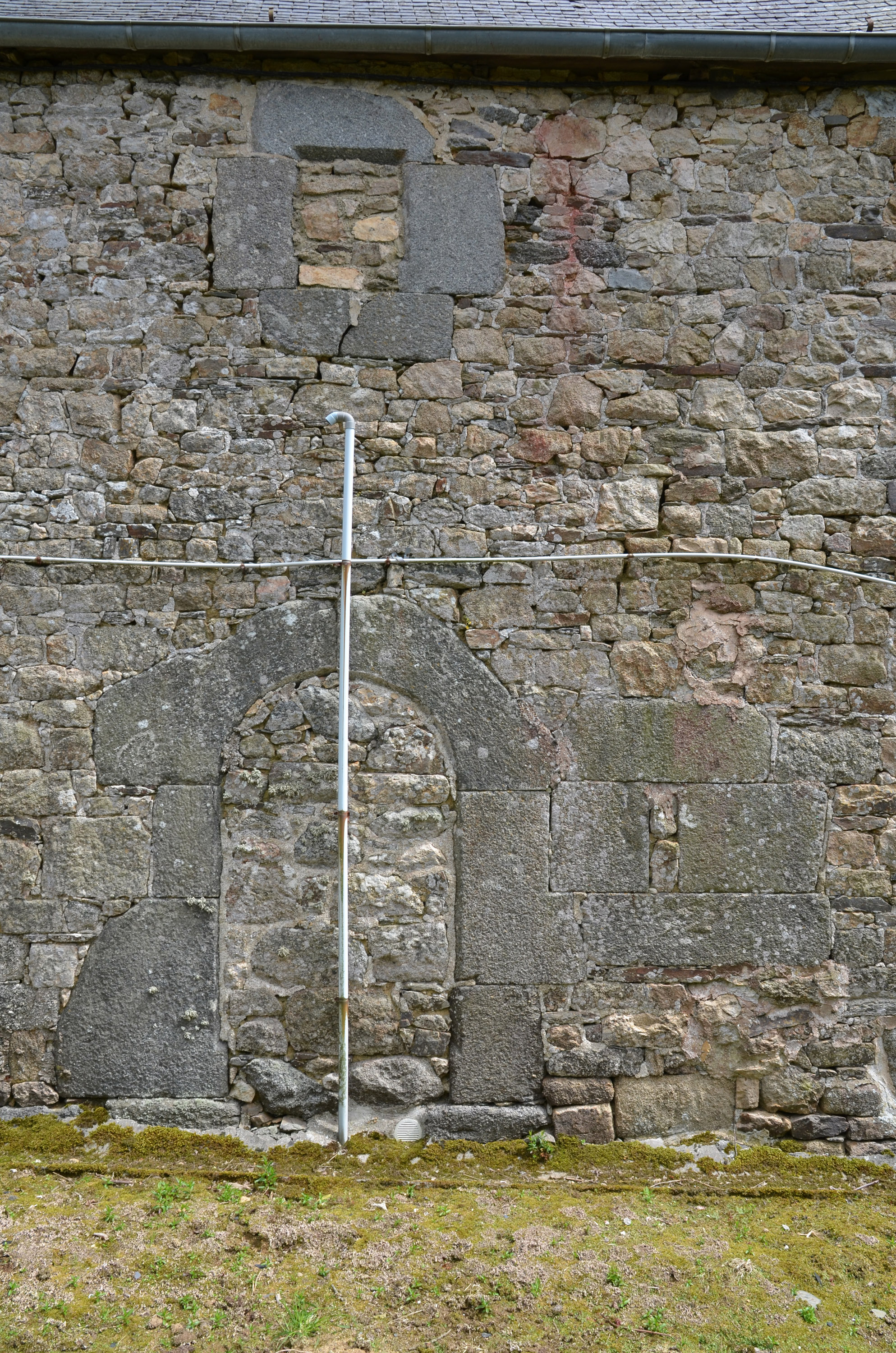 Ploubezre, Convenant Prigent : logis de ferme, élévation postérieure orientée vers le nord, porte en arc plein cintre et fenêtre murées. On distingue l'emplacement du saloir mural et son jourImmatriculation