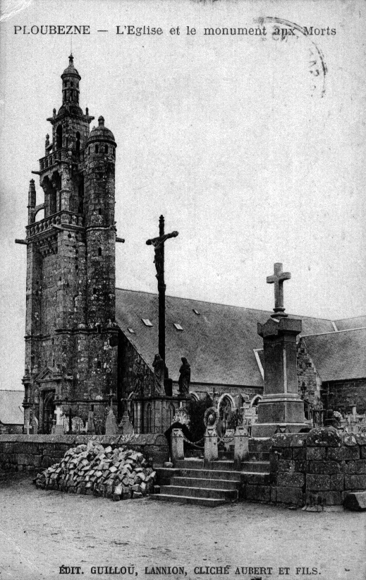 Ploubezre, le bourg : église paroissiale Saint-Pierre, calvaire et monument aux Morts, vue générale depuis le sud-ouest, carte postale (collection particulière)Immatriculation