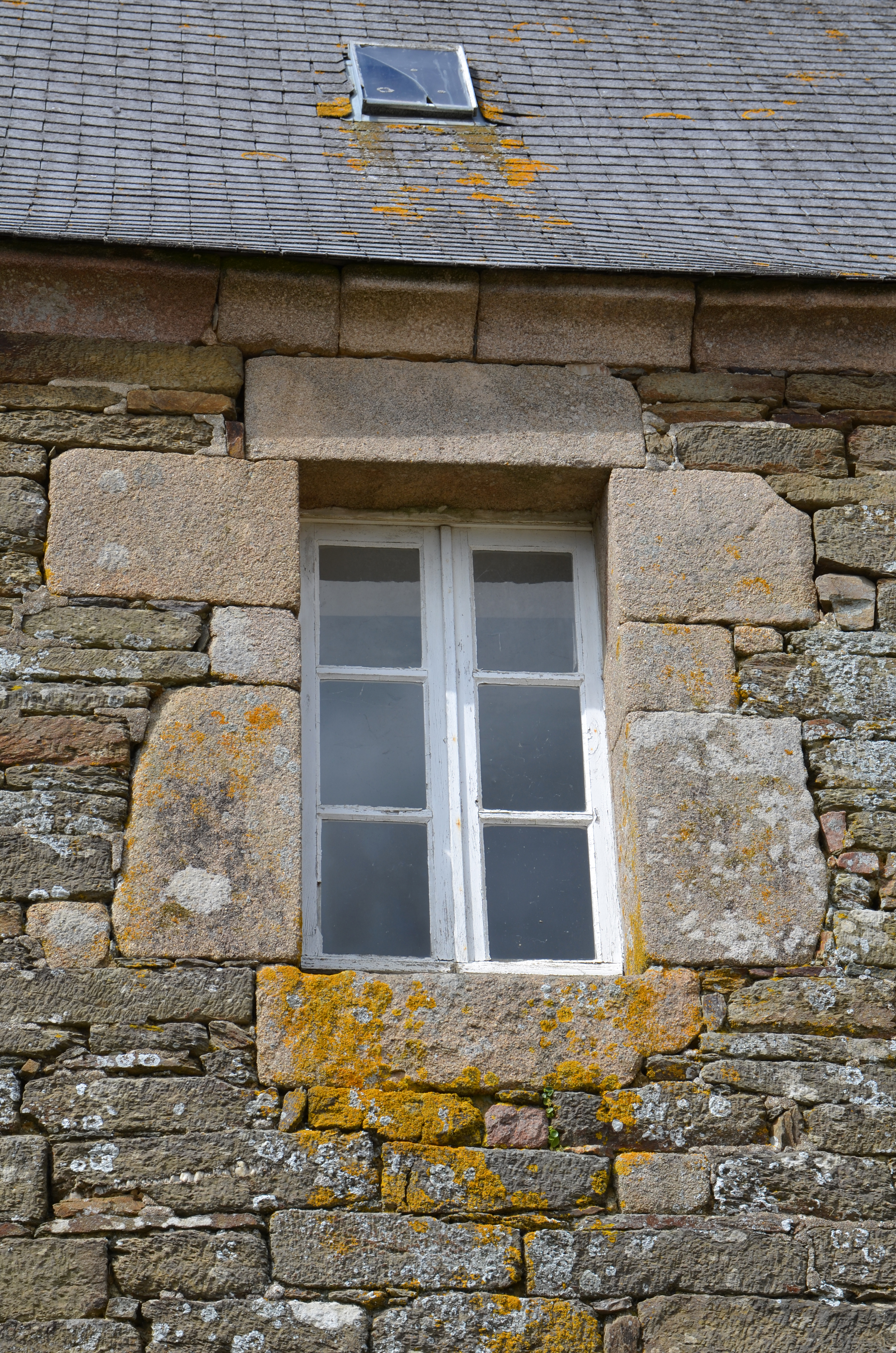 Ploubezre, rue Yves Le Cudennec : logis de ferme, élévation antérieure orientée vers le sud, détail de l'une des fenêtres de l'étage à linteau droit et de la corniche en graniteImmatriculation