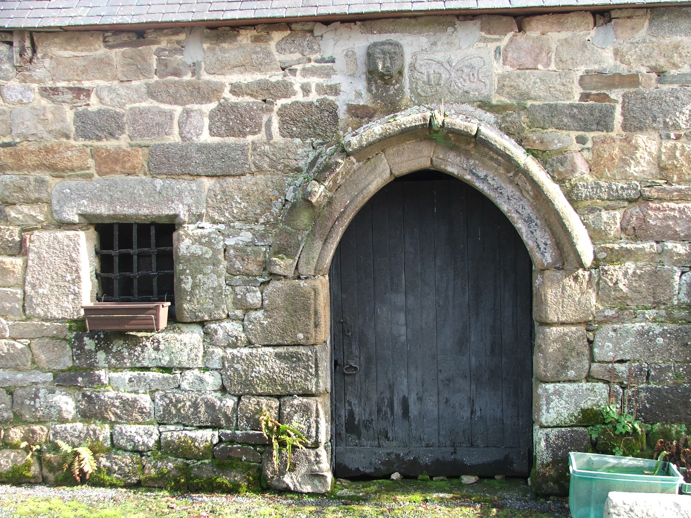 Ploubezre, Le Rest : logis de ferme, détail de porte et de la fenêtre (16e siècle) et de l'ornementation. On peut lire le millésime "1730"Immatriculation