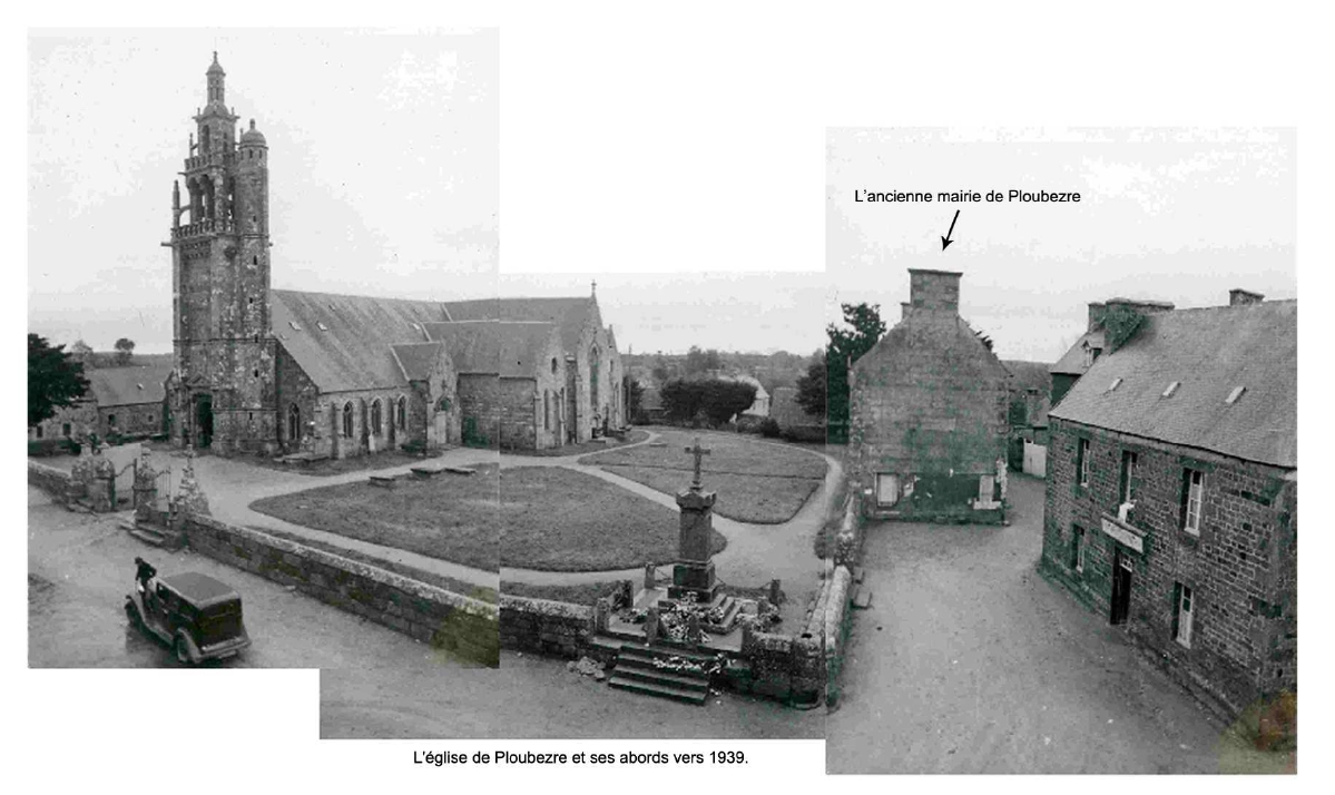 Ploubezre, le bourg : vue générale de la clôture de l'ancien cimetière, du monument aux morts, de l'église paroissiale et de l'ancienne mairie vers 1939 (Extrait de l'étude sur les périmètres modifiés de Ploubezre conduite en janvier 2014 par Erwan Le Bozec, "Patrimoine, Paysage, Urbanisme")Immatriculation