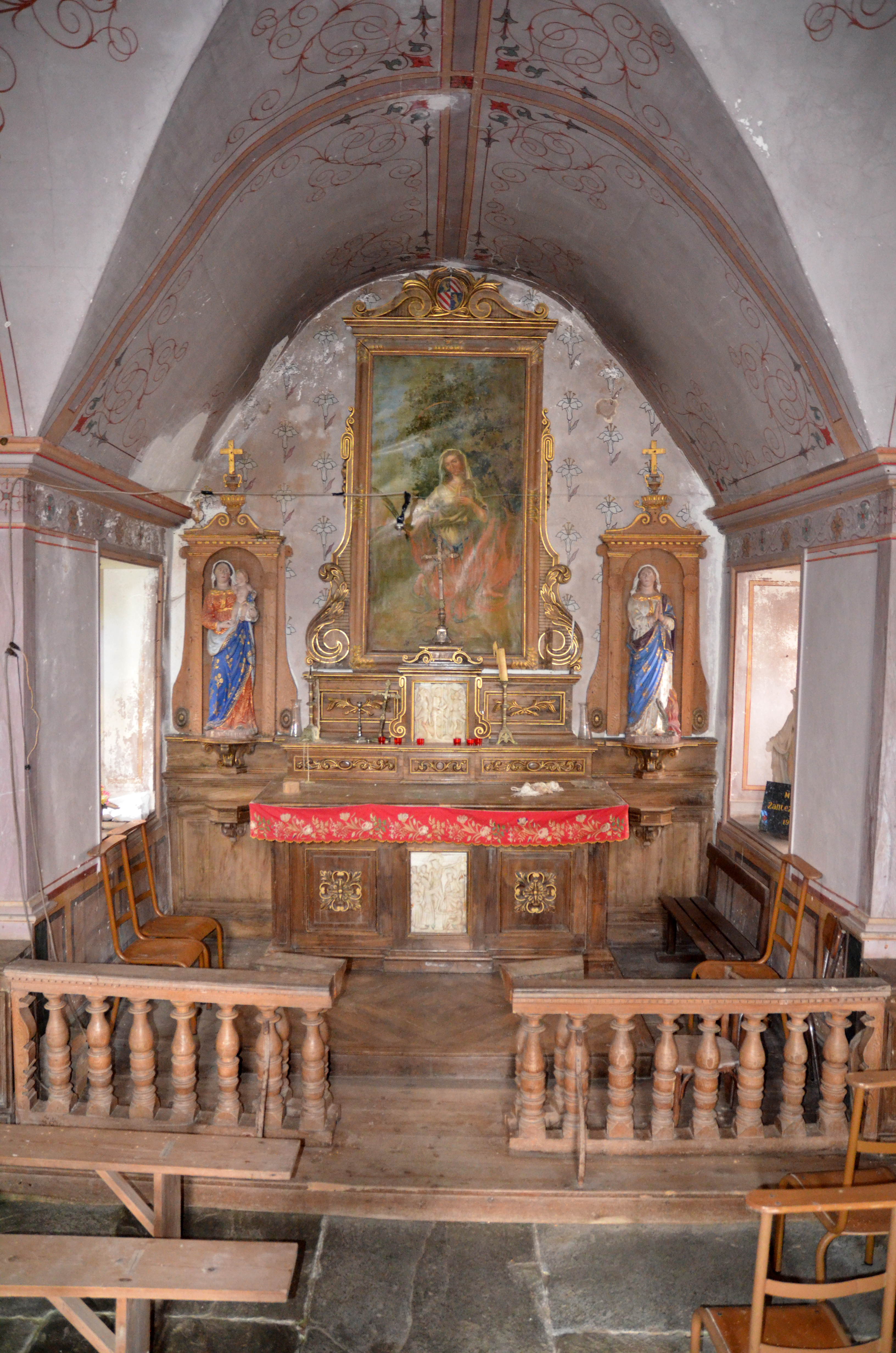Ploubezre, Keriel : chapelle Sainte-Thècle, vue intérieure, maître-autel et statuaireImmatriculation