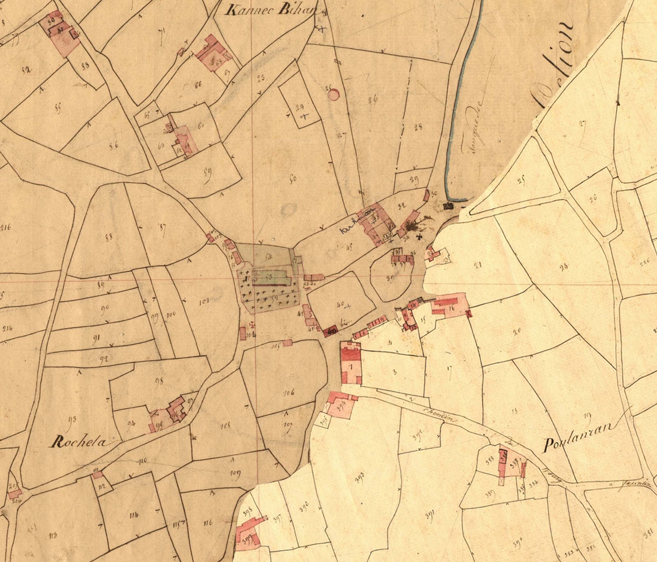 Extrait du cadastre ancien de la commune de Tonquédec, 1835 : le bourg (assemblage de deux feuilles du cadastre)Immatriculation