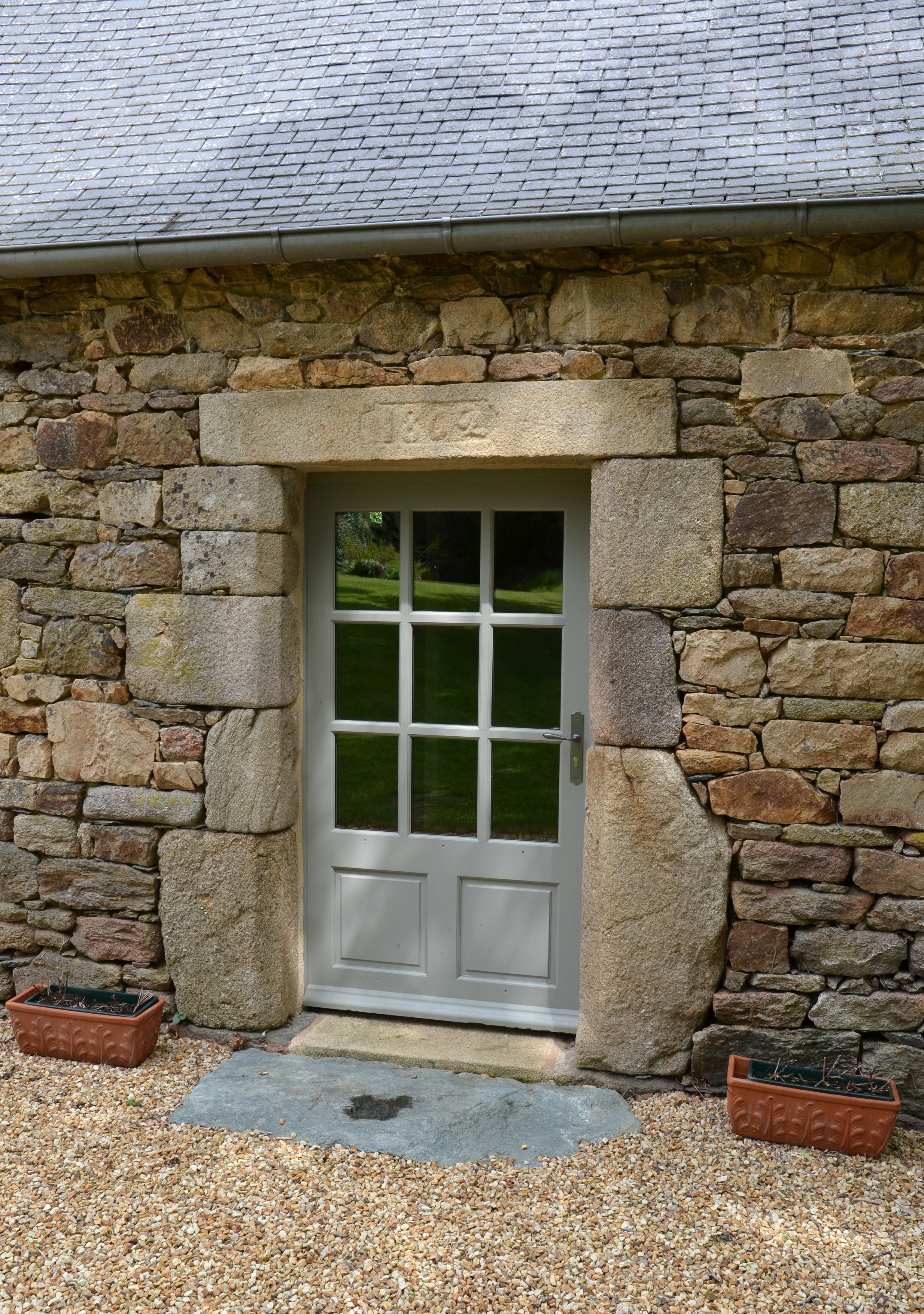 Trémel, Zan Logot : dépendance accostée à l'est du logis, détail du linteau daté 1802 (?)Immatriculation