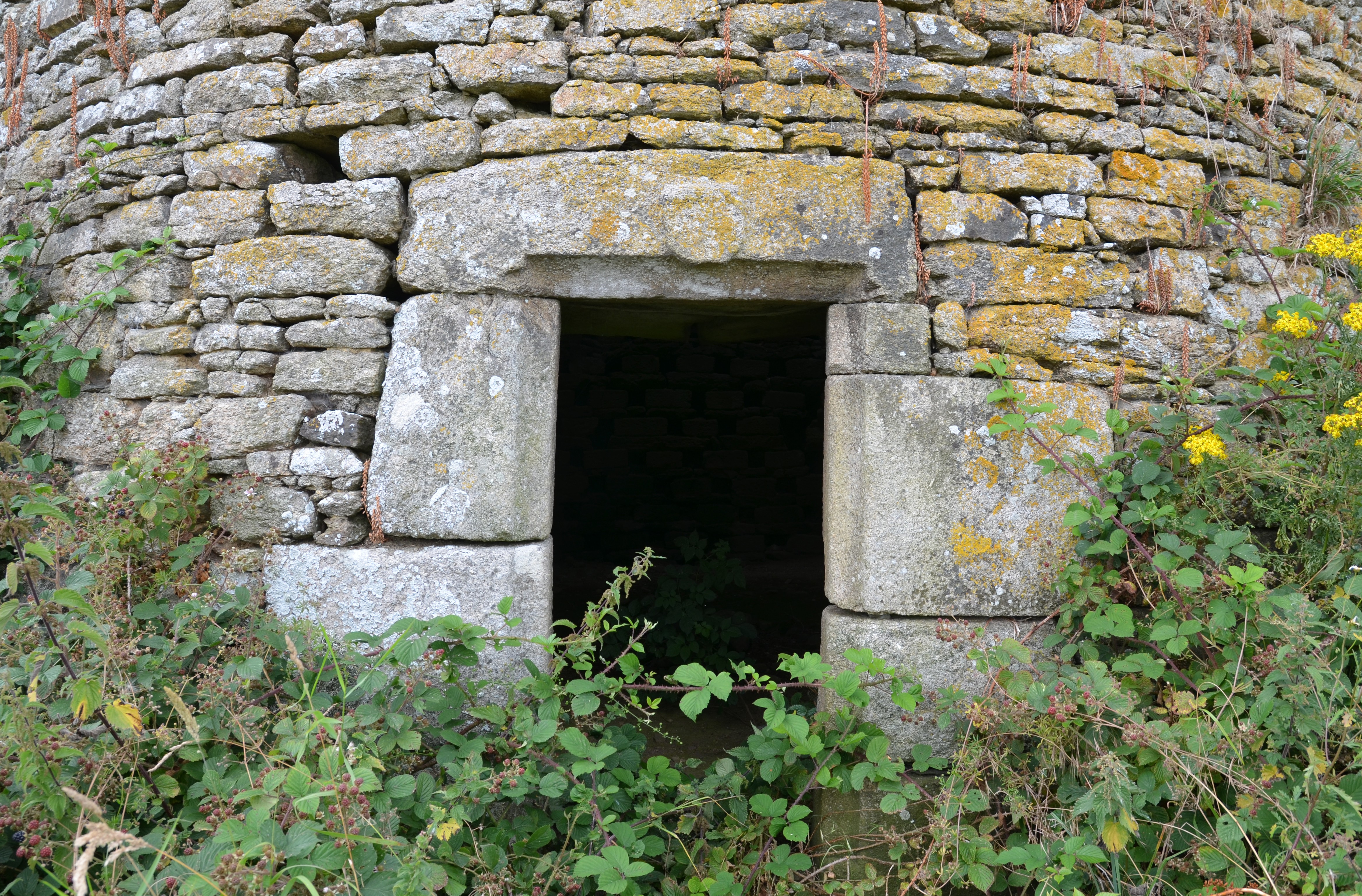 Trémel, Kermerzit : colombier datable du 16e siècle, détail de la porte à chanfrein. Le linteau est frappé d'armoiriesImmatriculation