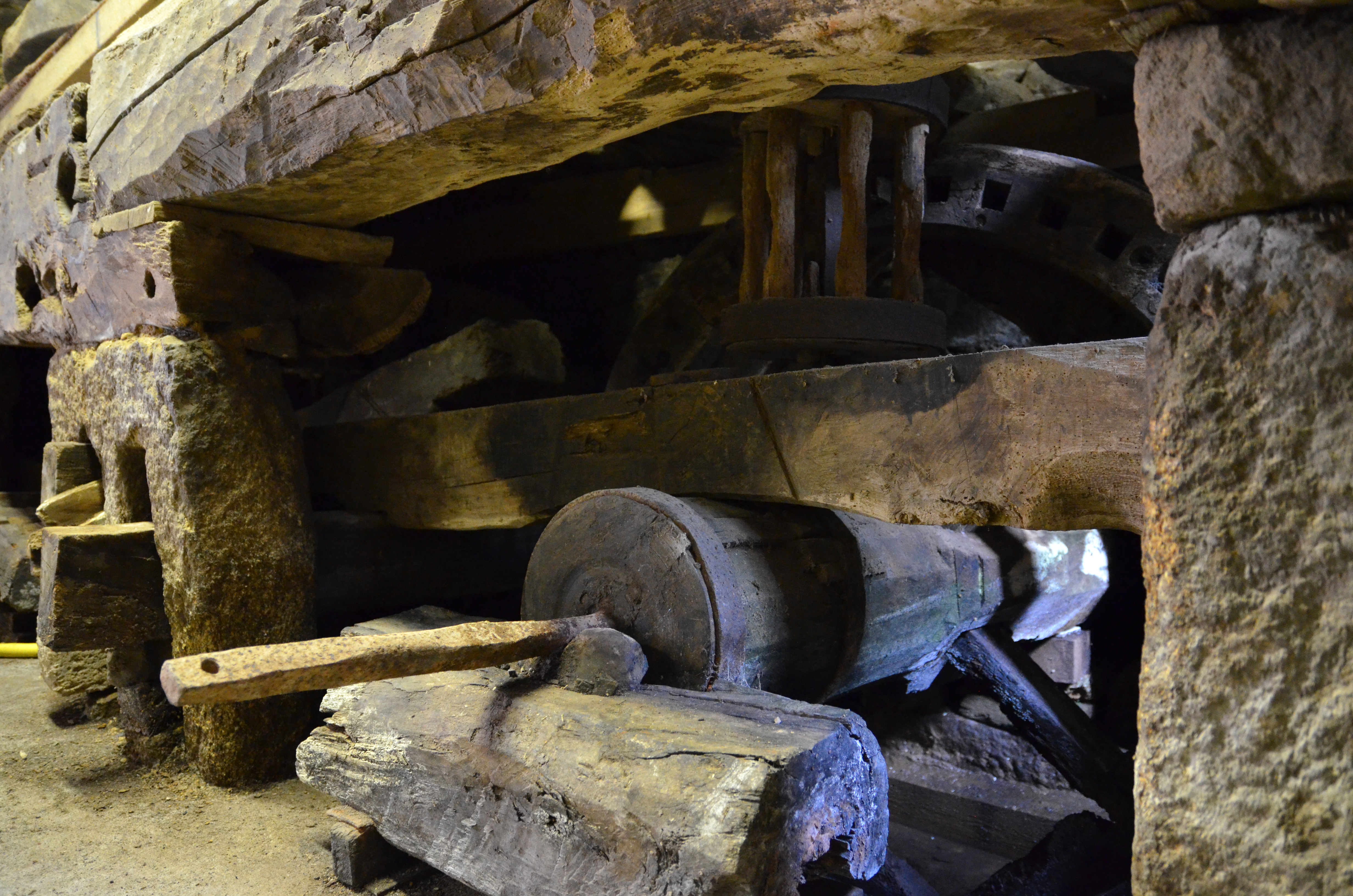 Trémel : moulin à eau de Kermerzit, détail de l'arbre. L'arbre entraîne une roue nommée "rouet" ou "roue d'angle"Immatriculation