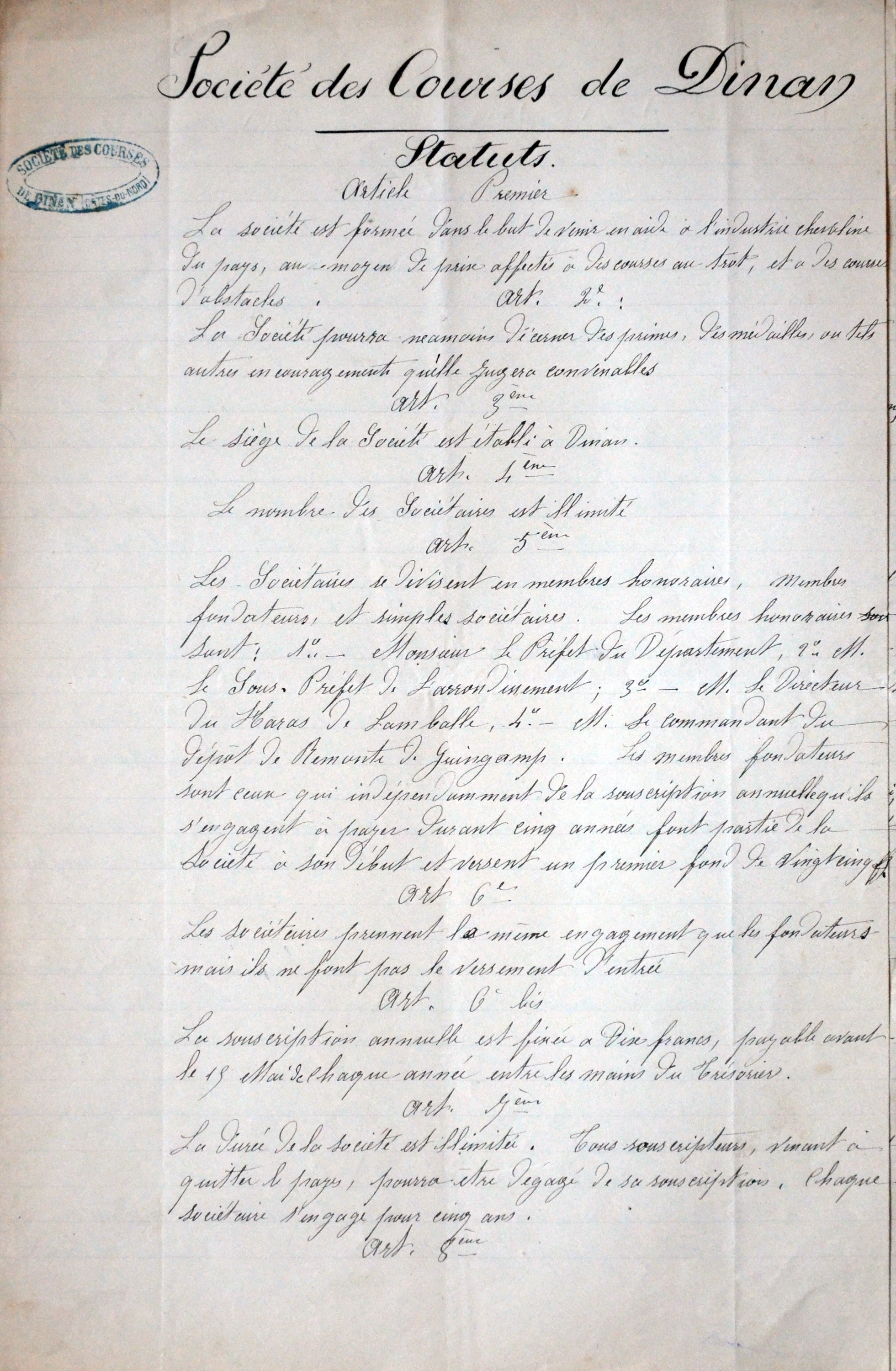 Société des courses de Dinan, statuts de 1862, page 2 (recto)Immatriculation