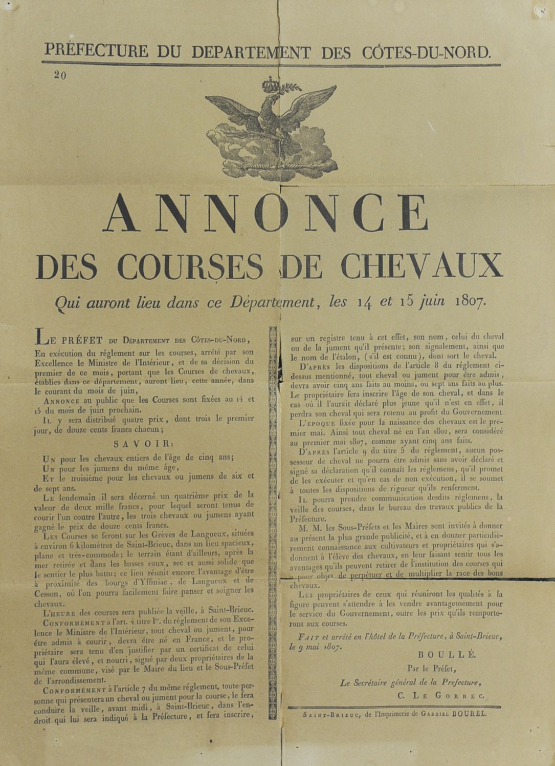 Hippodrome marin de Saint-Brieuc, annonce des courses de chevaux, 14 et 15 juin 1807Immatriculation