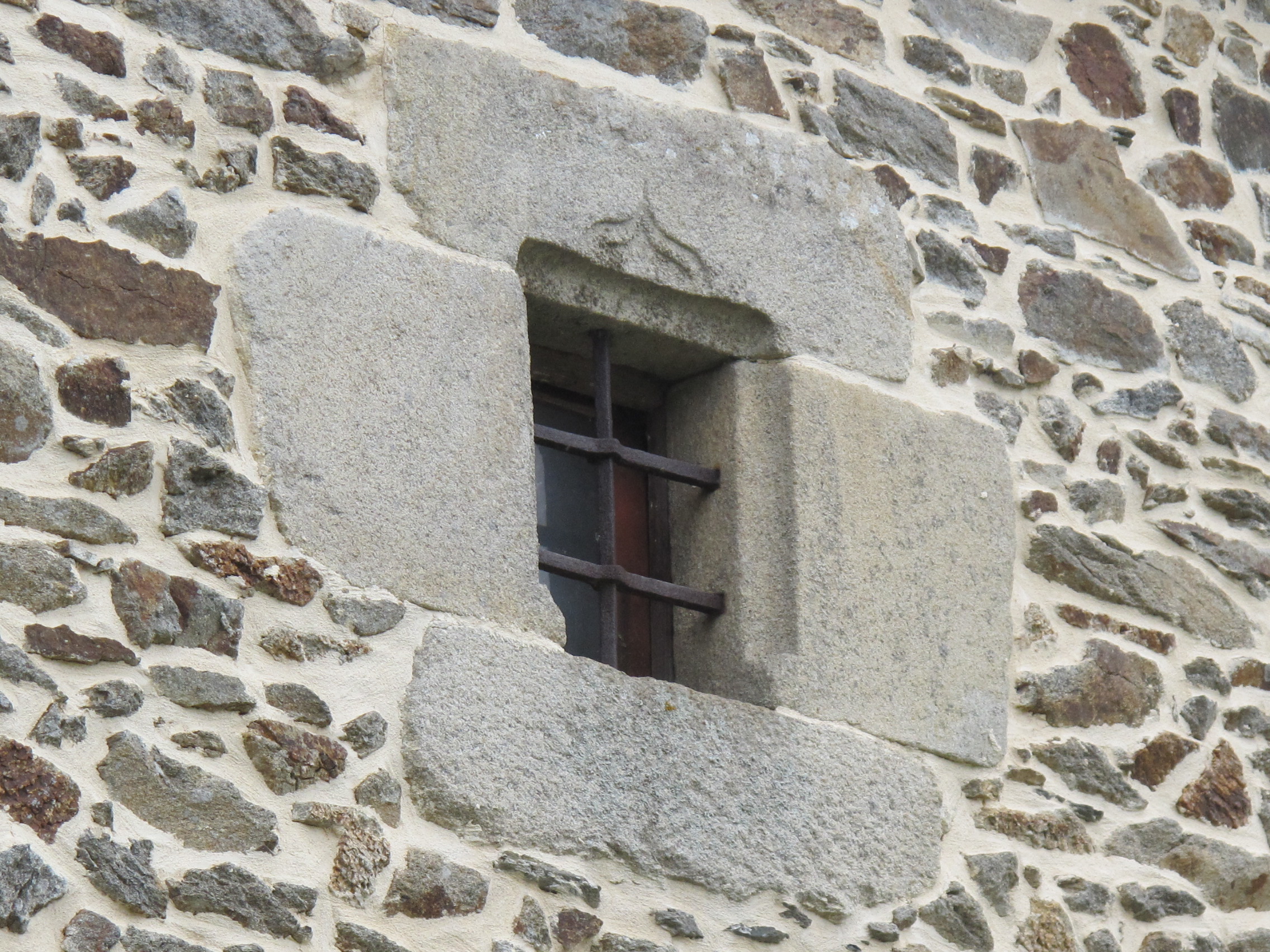 Détail: linteau sculpté d'une fenêtre au premier étage, façade latérale. Vue du jardin.Immatriculation