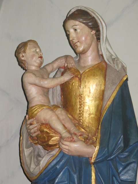 Statue en bois de la Vierge à l'Enfant, détail. Vue de la nef.Immatriculation