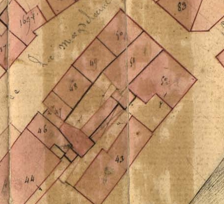 Extrait du cadastre de 1844, implantation présumée de l'auberge Tourondel, parcelles 48,49, 50Immatriculation
