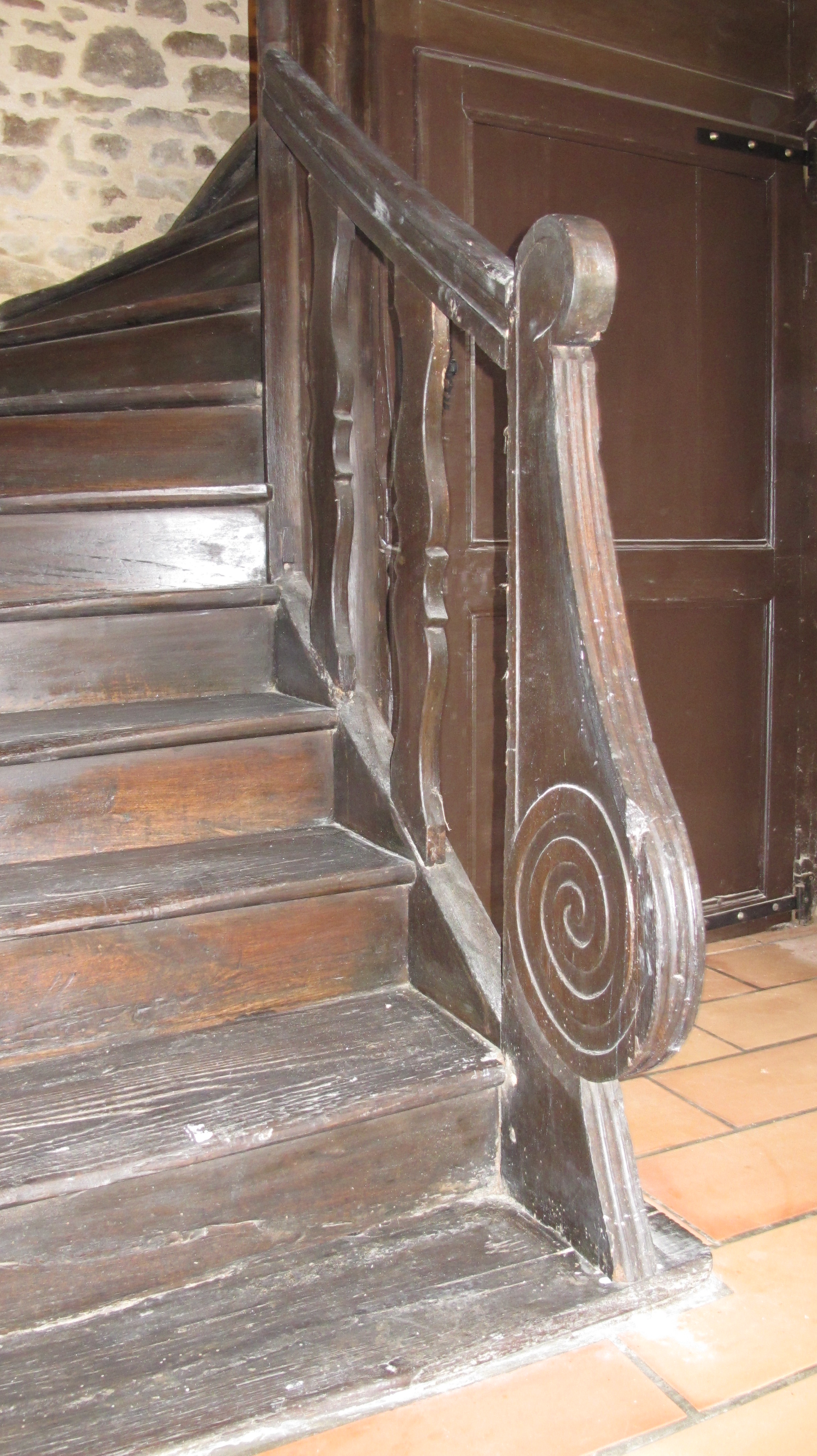 Le Colombier, escalier en charpente, départ avec enroulement, balustres plates, limite 18e siècle 19e siècleImmatriculation