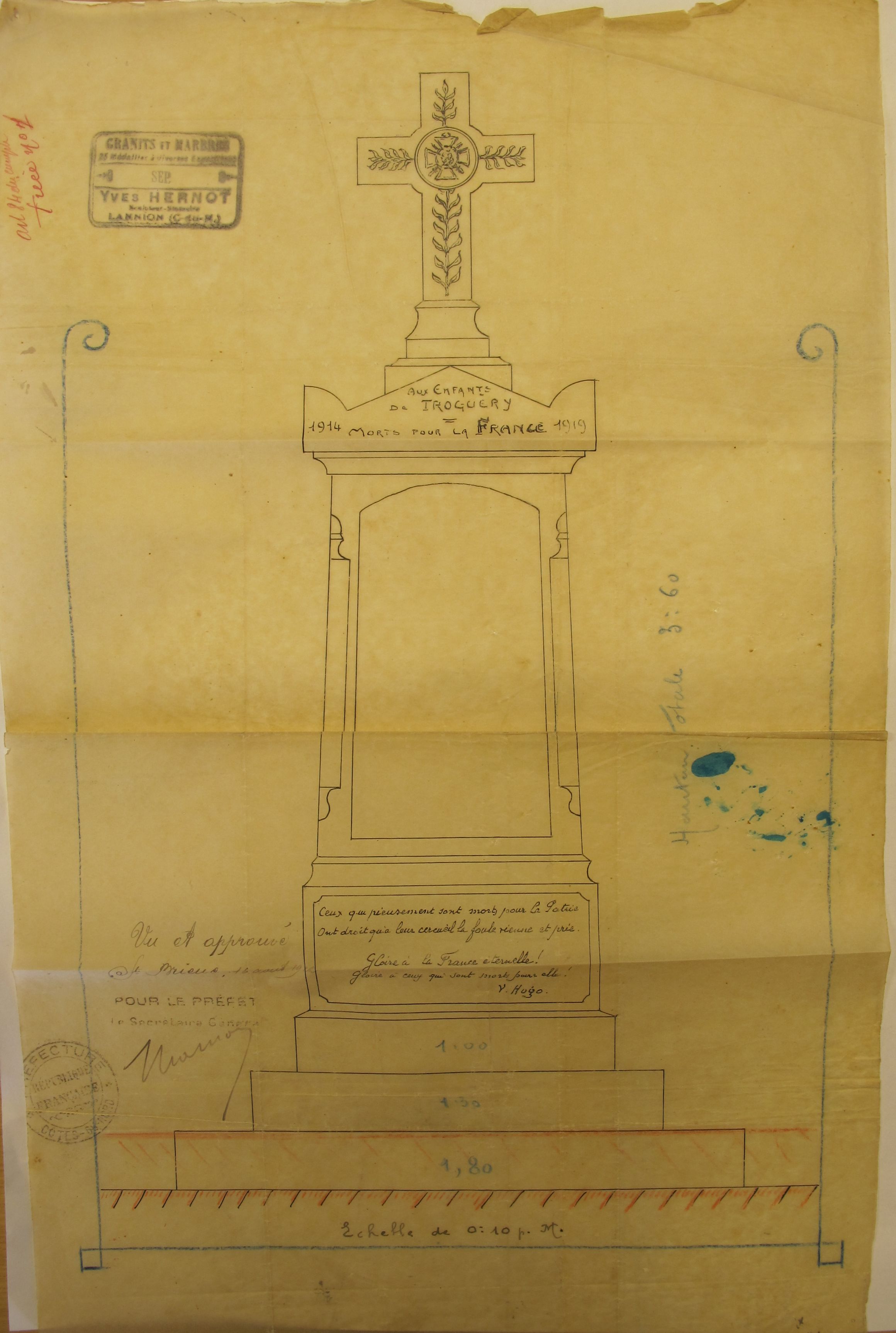 Dessin du monument aux morts, 1922. Atelier Yves Hernot à Lannion (A.D. 22, série 2 O 383/2)Immatriculation