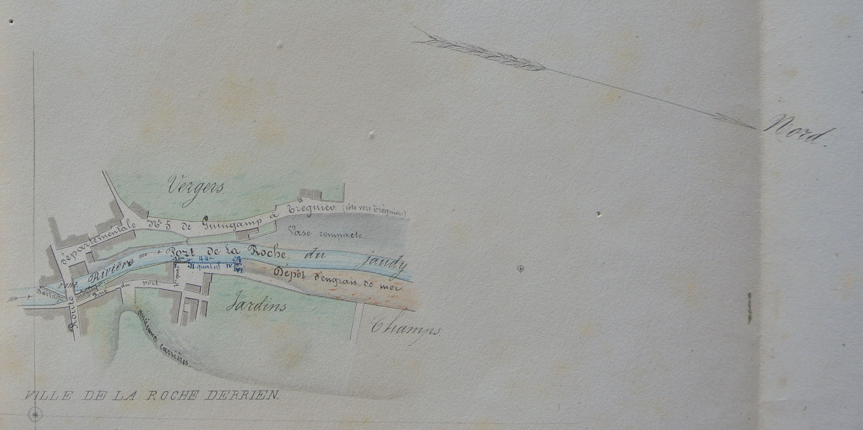 PLan du port de La Roche-Derrien par l'ingénieur Delaruë, 1856. Mur du vieux quai signalisé par une ligne hachée noir et mur du nouveau quai signalé par une ligne hachée bleue (A.D. 22, série S supplément 171)Immatriculation
