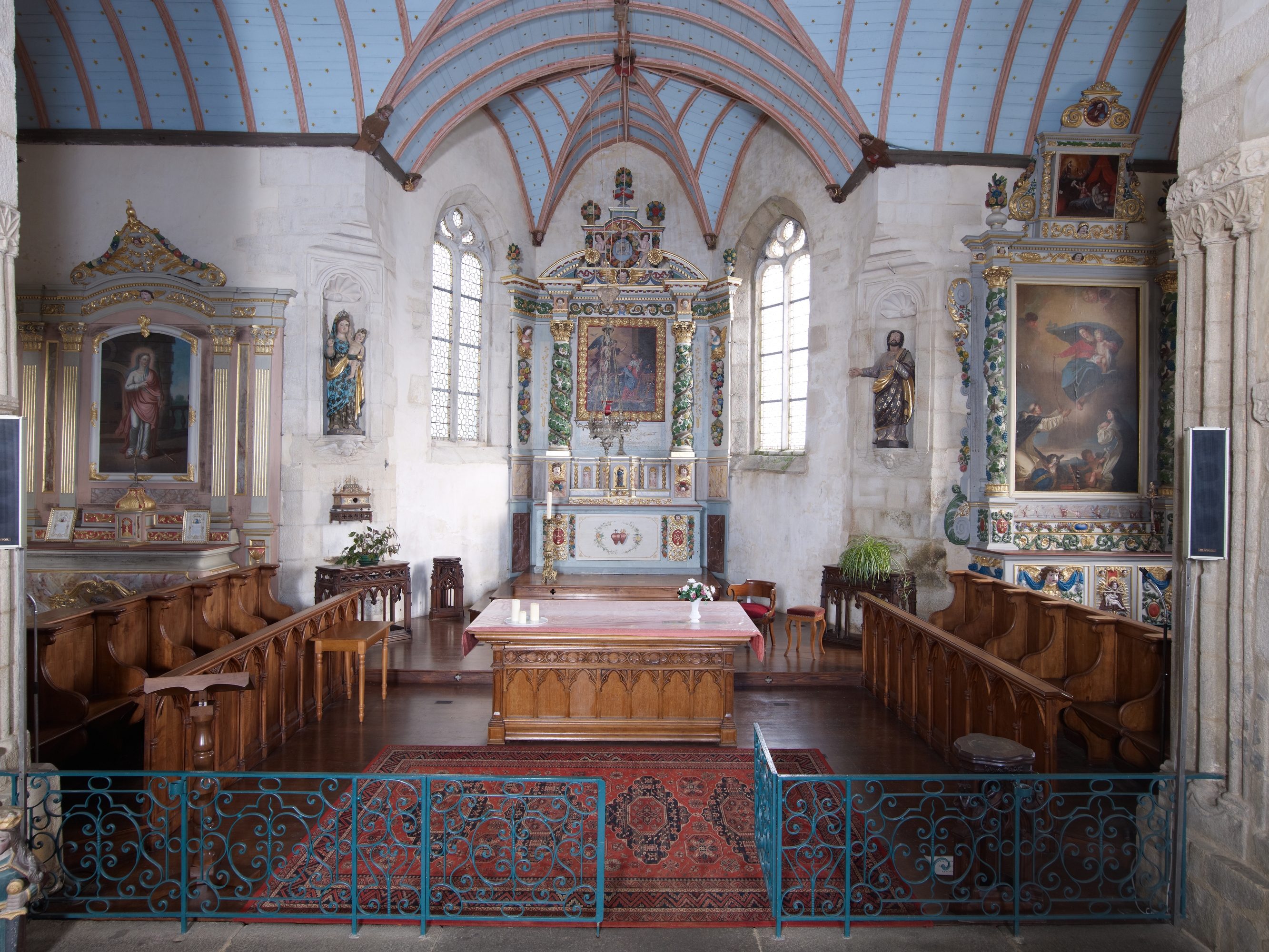 Vue générale du chevet et bras du transept : maître-autel et retables latérauxImmatriculation
