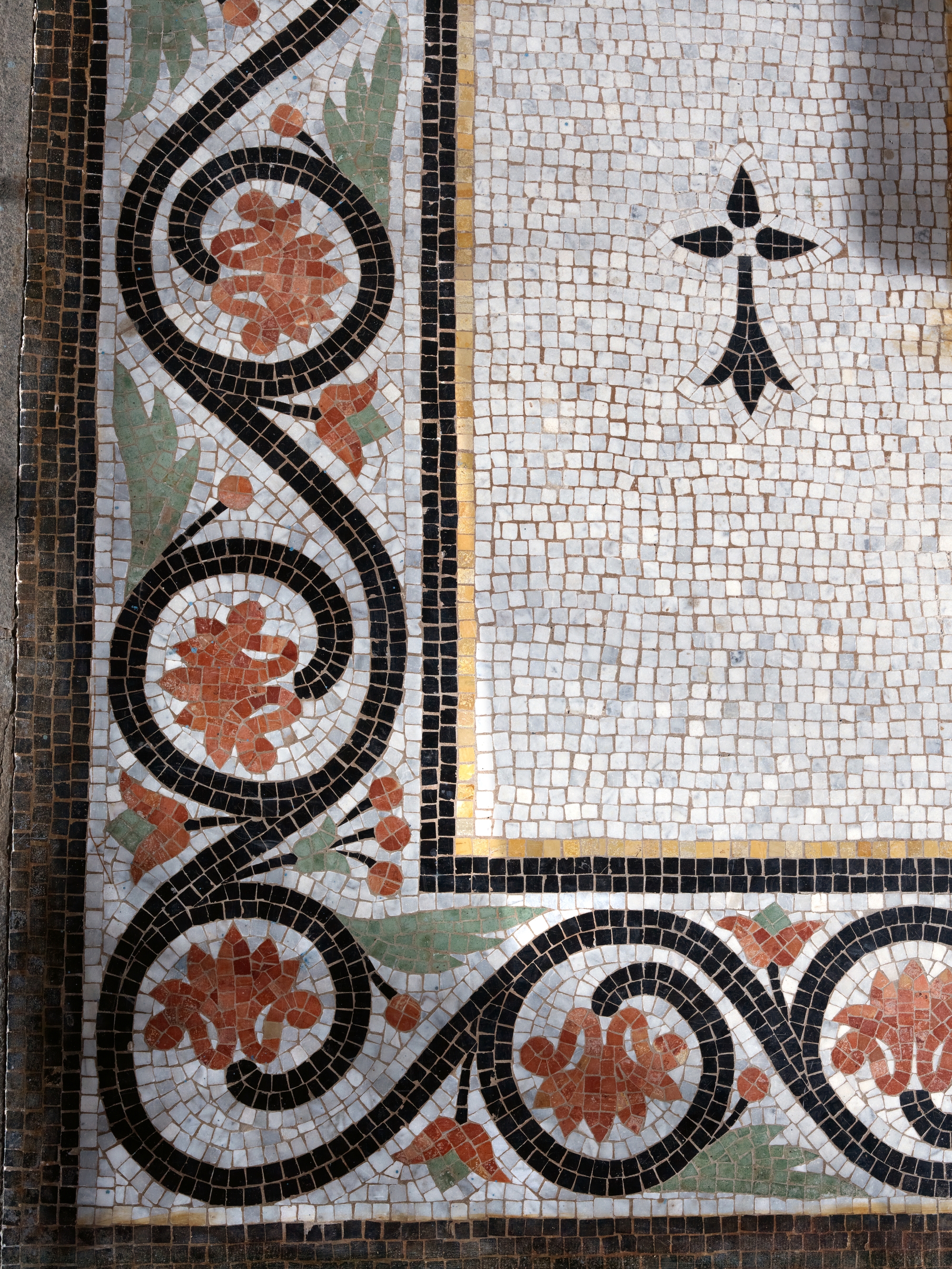 Eglise Saint-Idunet : détail de la mosaïque au sol (au pied de l'autel)Immatriculation