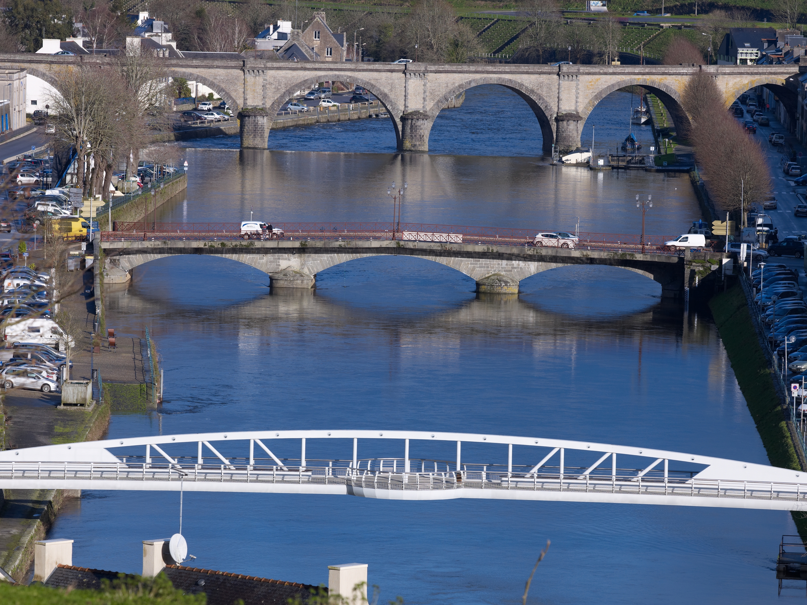 Vue des trois ponts traversant l'Aulne au niveau de la ville de ChâteaulinImmatriculation