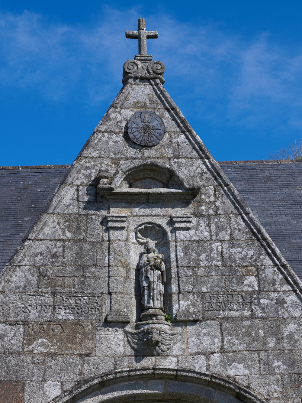 Chapelle Notre-Dame : porche sud, fronton, cadran solaire, statue Vierge à l'EnfantImmatriculation