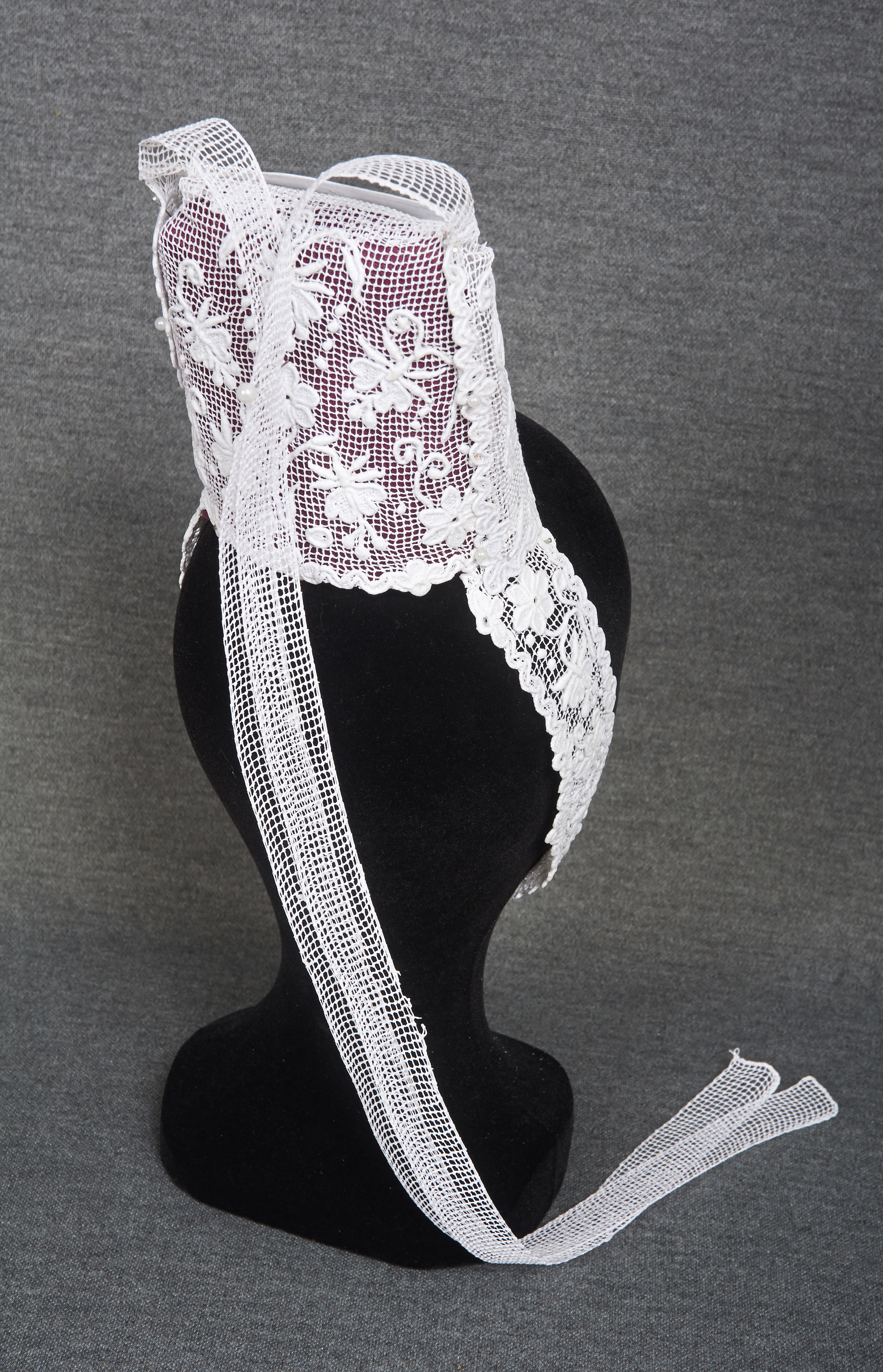 Borledenn authentique visible à la maison du filet brodé, ty a roued brodet, à Plouénan (29) Face arrière de la coiffeImmatriculation