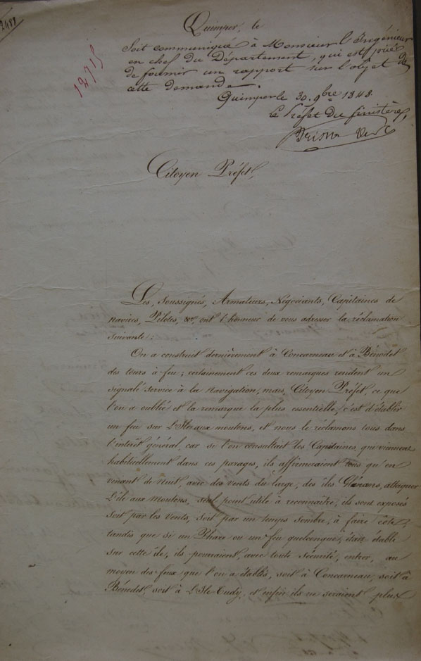 Pétition d'armateurs, négociants, capitaines de navires, pilotes, pour l'établissement d'un feu pour l'île aux Moutons, 1848Immatriculation