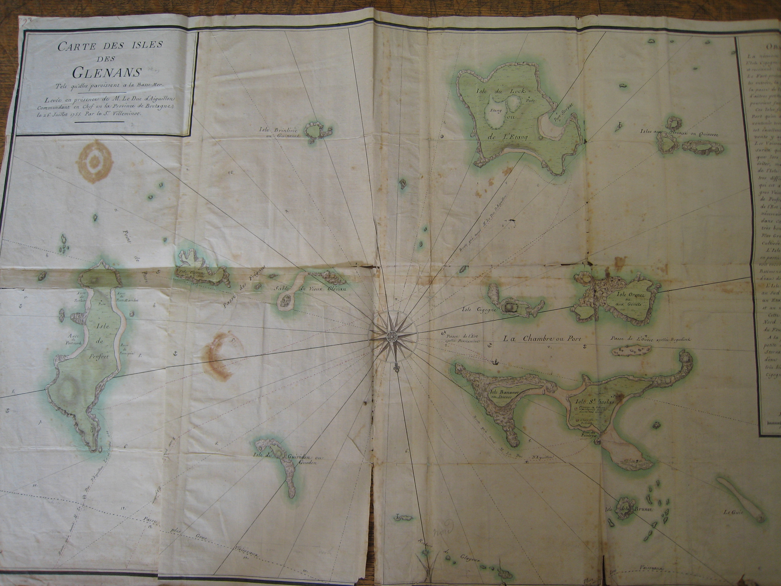 Carte des Isles des Glénans tels qu'elles paroissent à la basse mer. Levée en présence de M. le Duc d'Aiguillon, Commendant en chef de la Province de Bretagne. Le 26 juillet 1755 par le Sr Villeminot