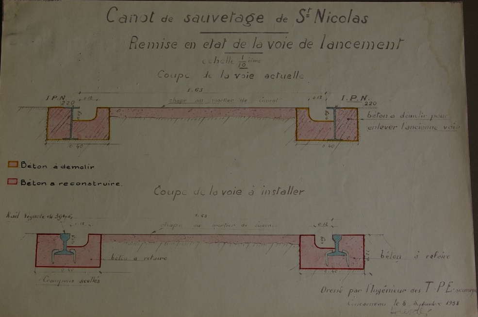 Remise en état de la voie de lancement du canot de sauvetage de St Nicolas, 1938Immatriculation