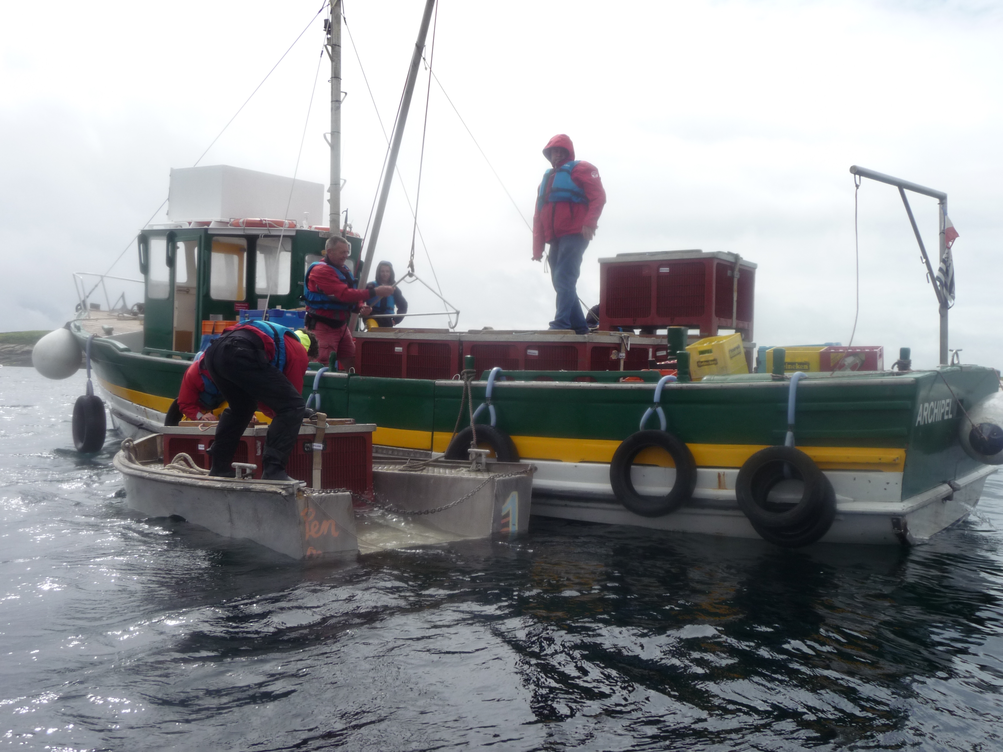 Cadillac à couple de l'Archipel -déchargement des caisses -vue latérele - Penfret -mai 2014Immatriculation