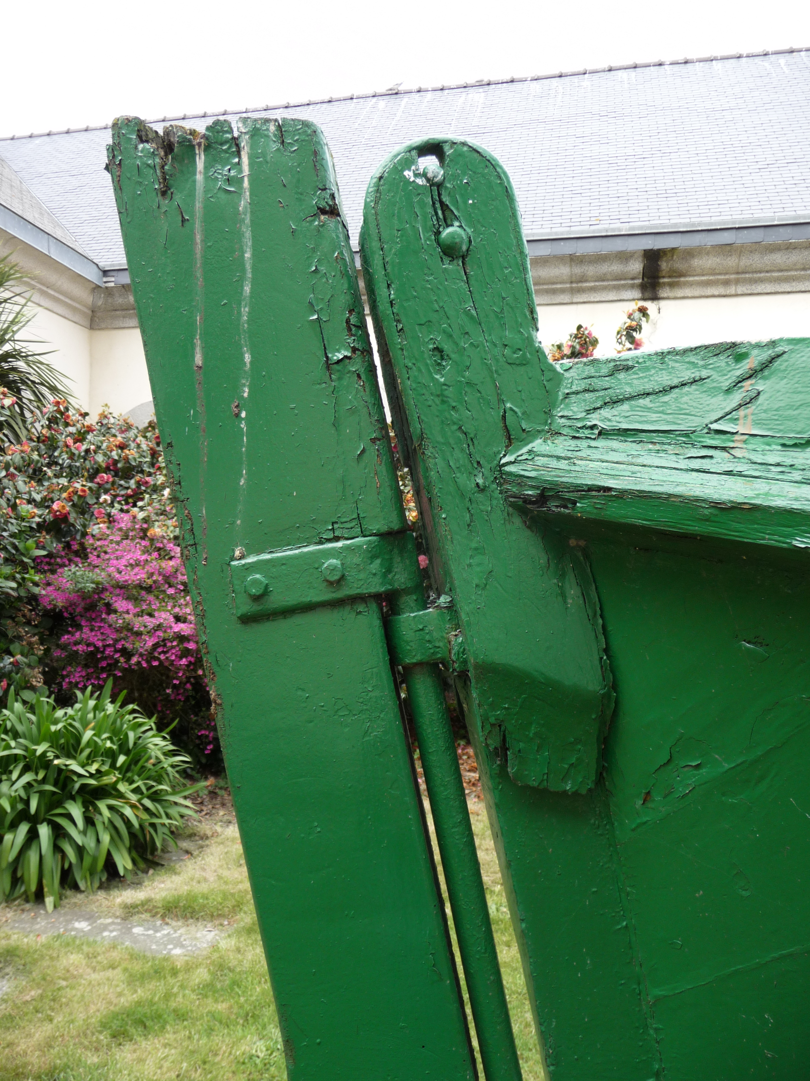 Vue tribord du gouvernail, étambot et davier avec réa de poulie pour amarre de halage, Commandant Garreau, avril 2014Immatriculation