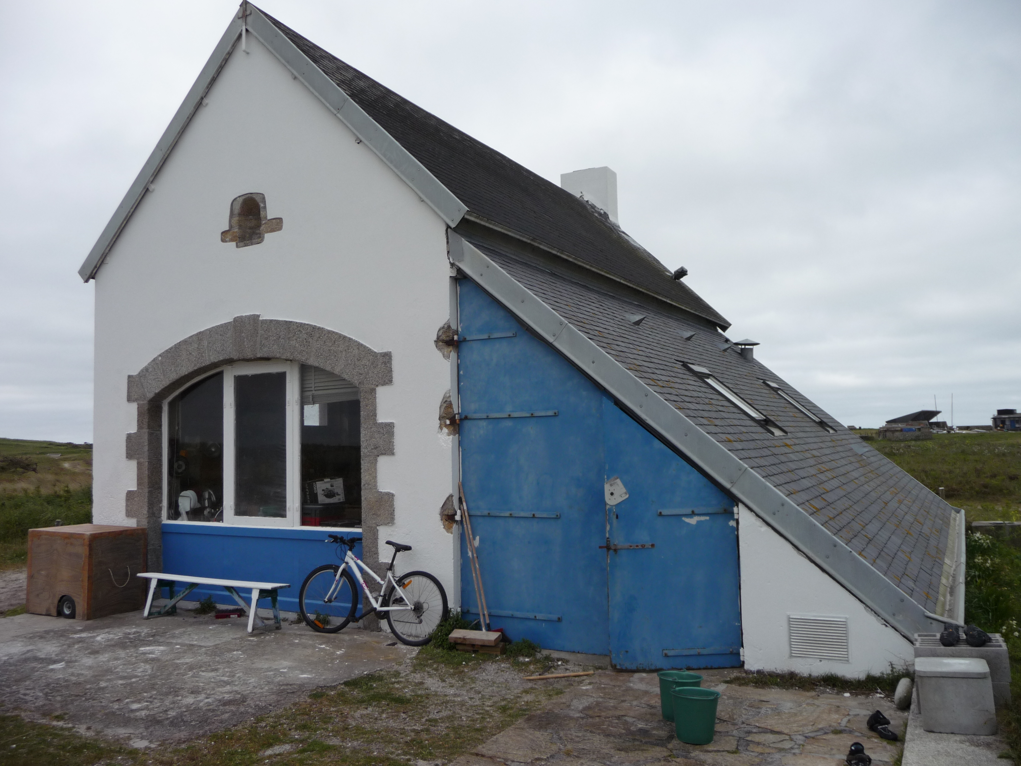 Canot de sauvetage et son appentis, entrée principale, garage et local batteries - Penfret, mai 2014.Immatriculation