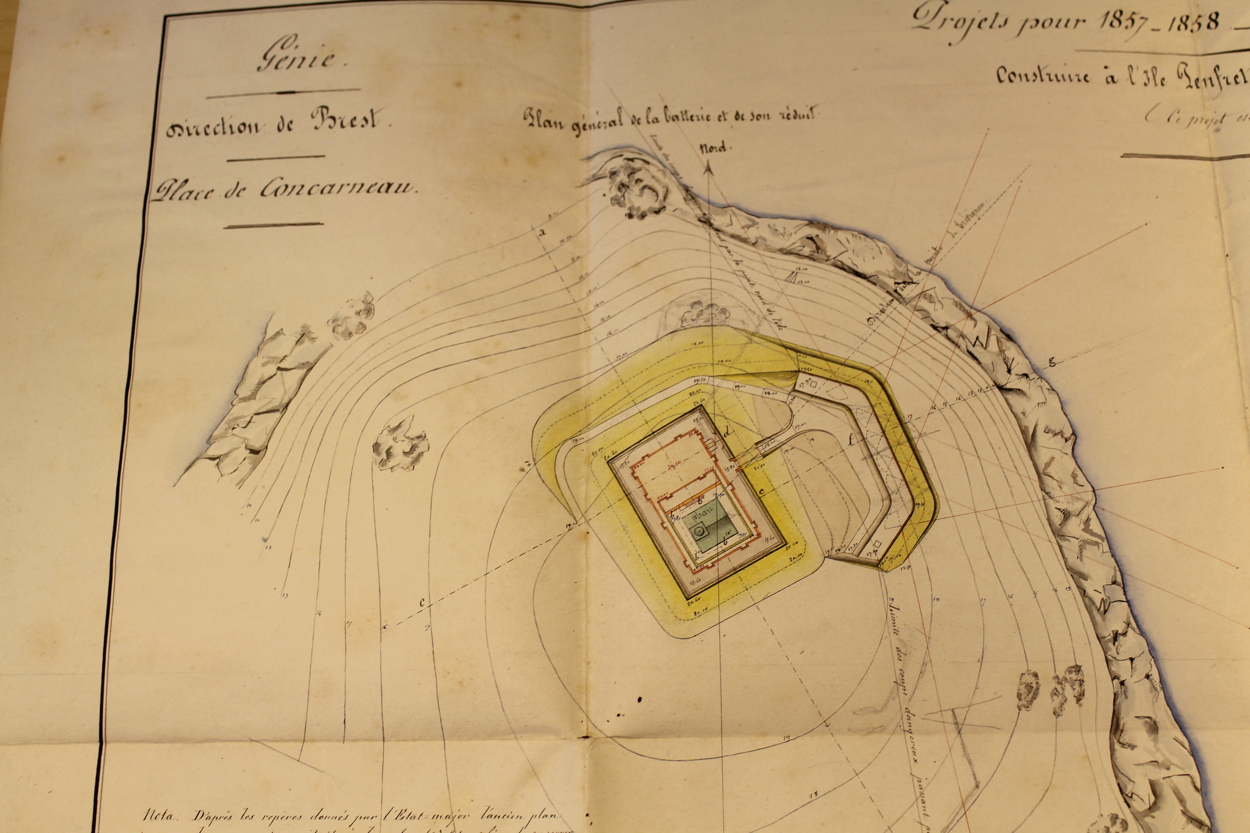 Construire à l'île Penfret une batterie pour 8 bouches à feu avec réduit, signé par le capitaine du génie en chef, Rousseau, le 30 décembre 1857, contresigné parle directeur des fortifications, Brest le 20 janvier 1858
