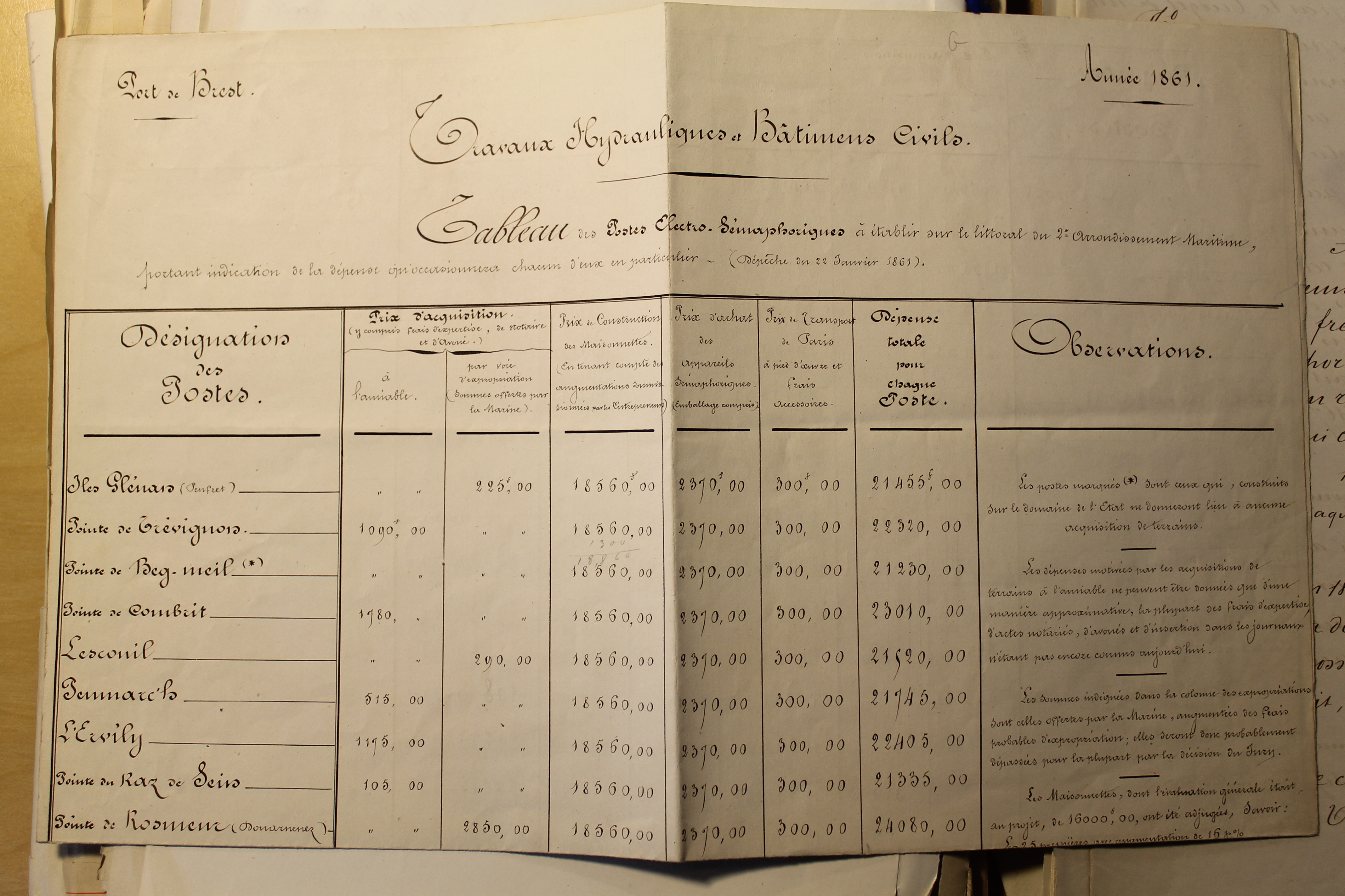 Tableau des postes Electro-sémaphoriques à établir sur le littoral du 2ème arrondissement maritime, portant à la dépense qu'occasionnera chacun d'eux en particulier. Dépêche du 22 janvier 1861.Immatriculation