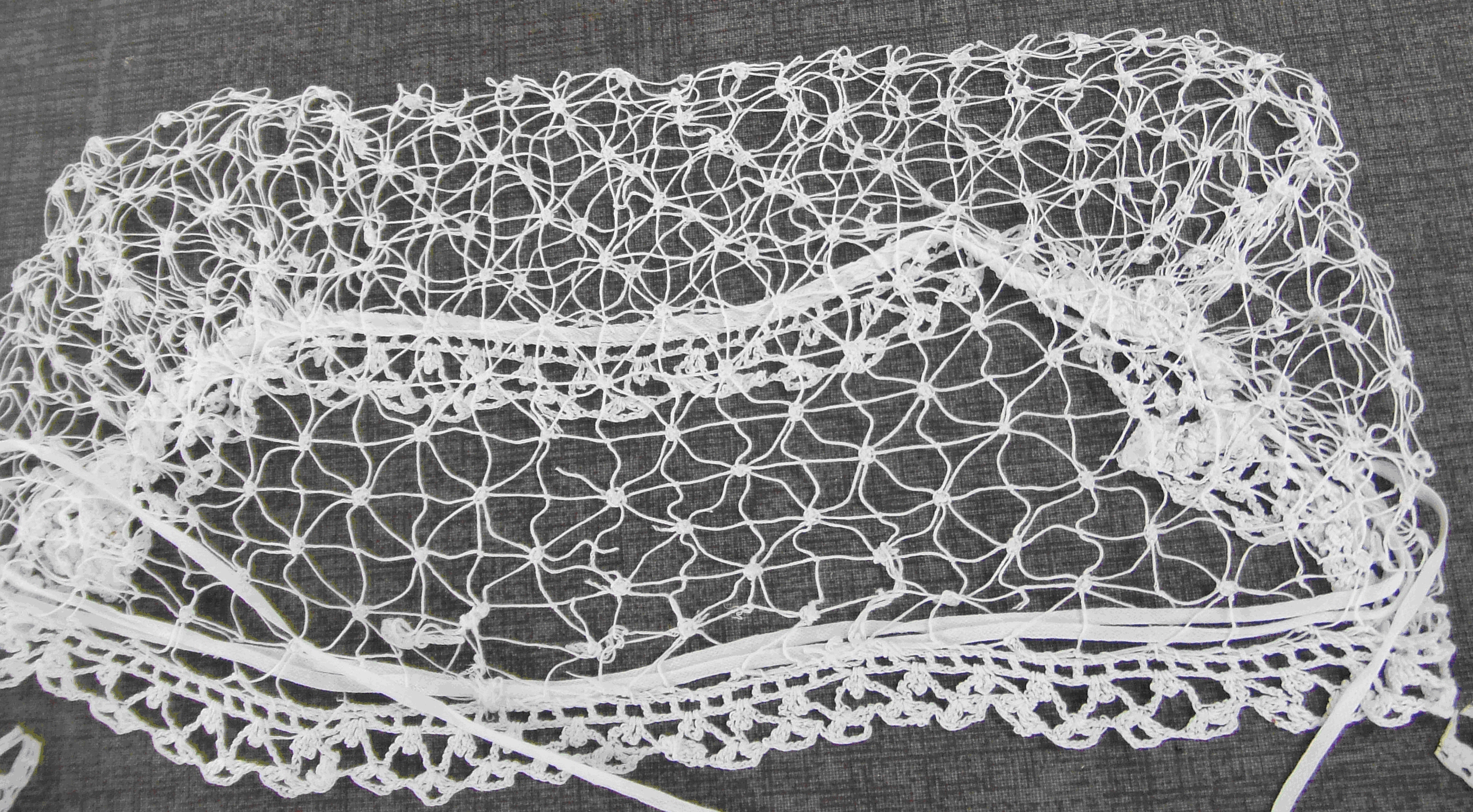 Coiffe réalisée avec un maillage très grand (moule 5 environ) agrémentée de petites araignées.Immatriculation