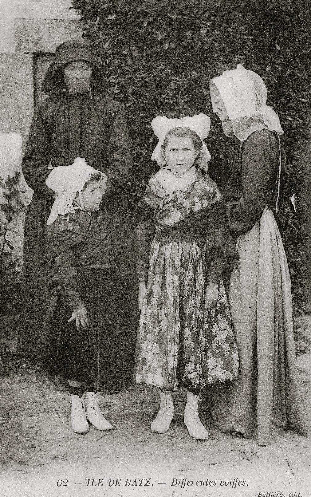 Carte postale montrant les différentes coiffes portées qui coexistaient sur l’île au début du XXe siècle. Collection particulière d'Annie GallouImmatriculation