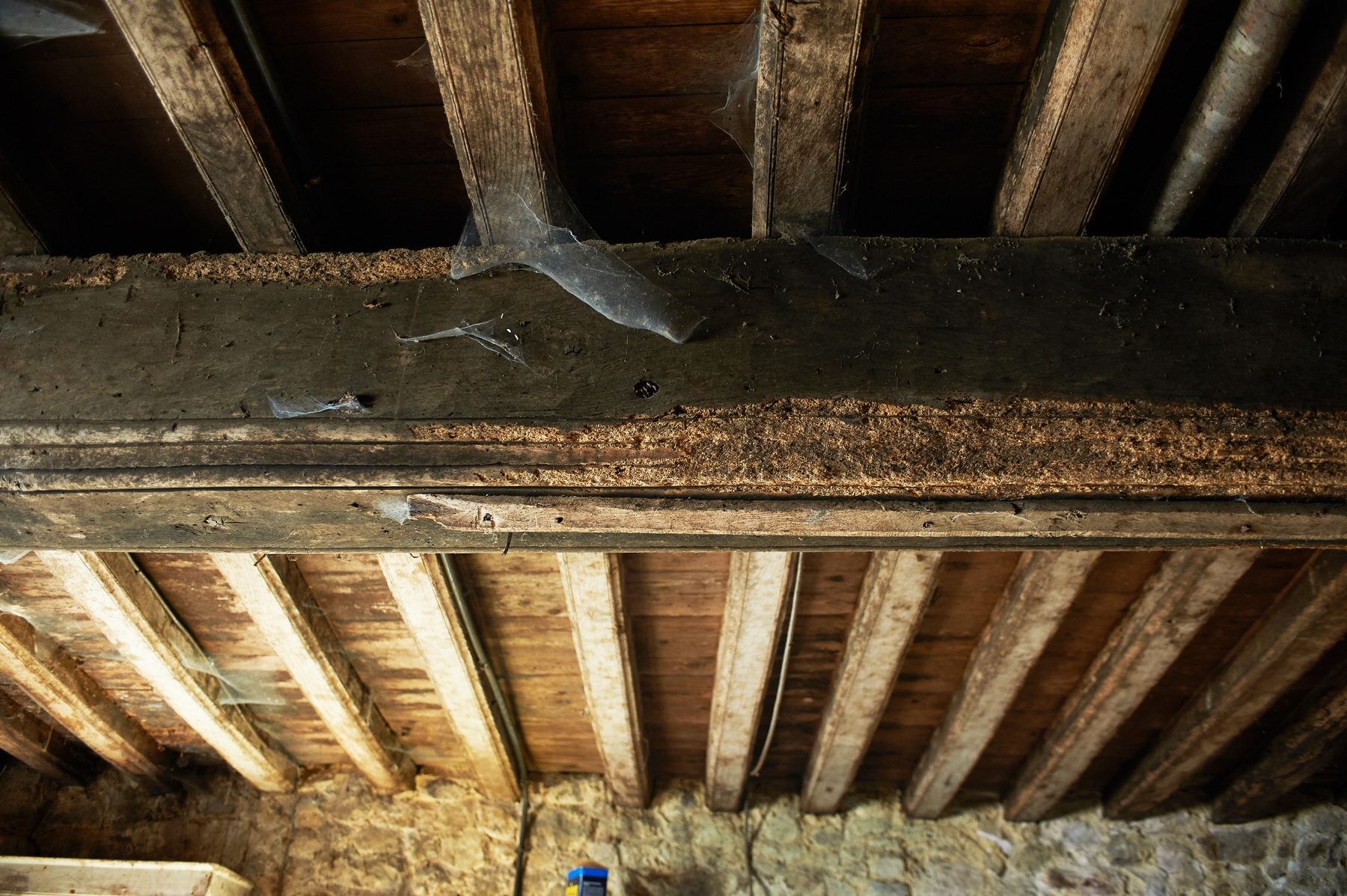 Vue du plafond à poutres moulurées et solivesImmatriculation