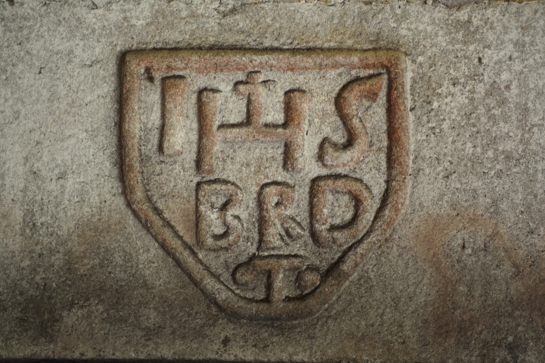 La Herblinais - Maison, cheminée, détail de l'écusson. Inscription : IHS / BRD / .T.Immatriculation