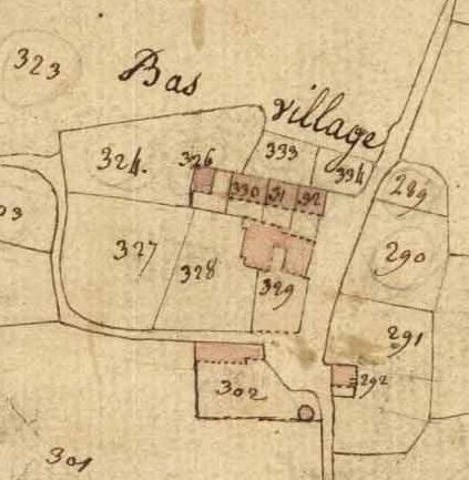 Le Bas Village sur le cadastre napoléonien du premier quart du 19e siècle. Maison à l'est de la route.Immatriculation