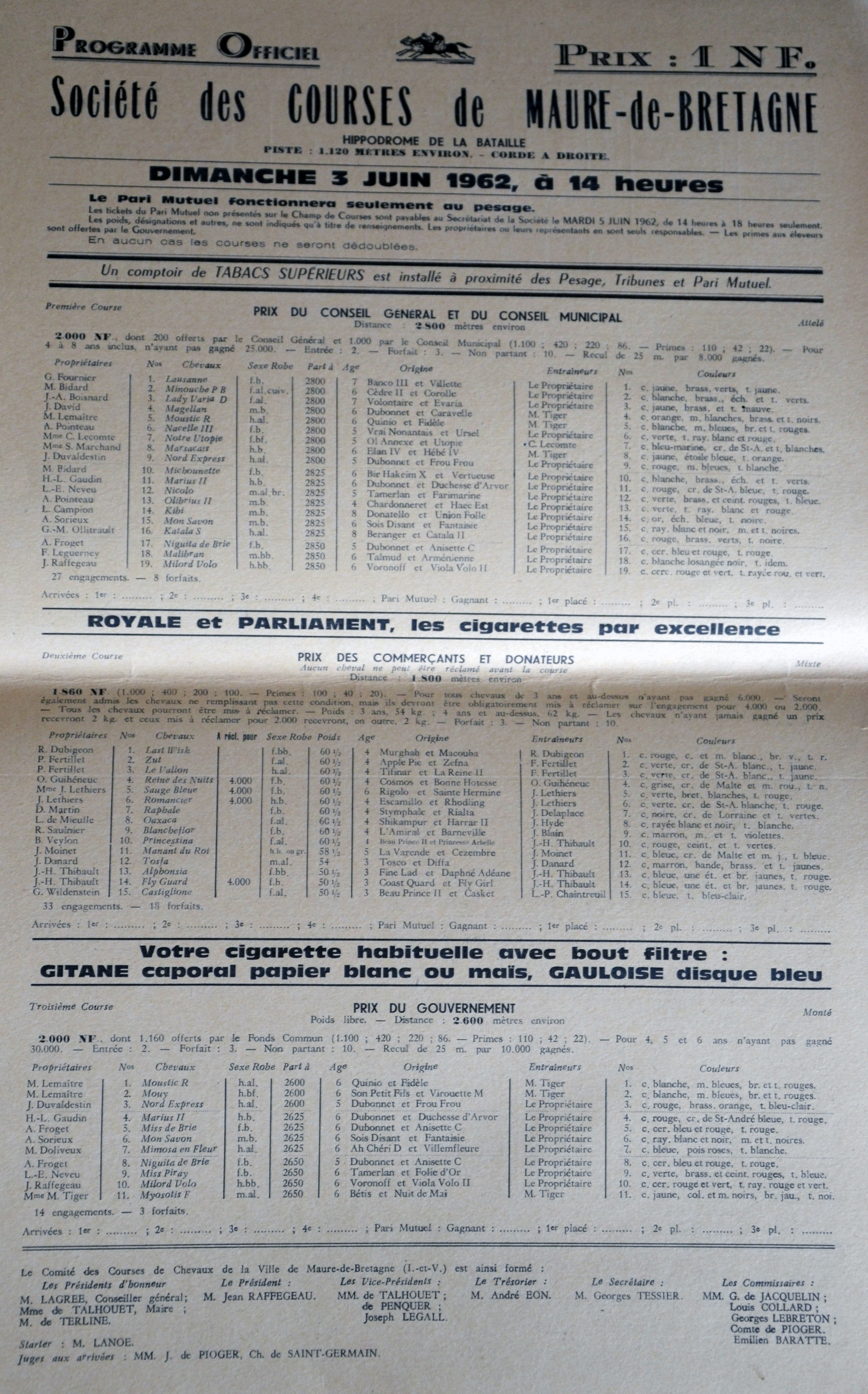 Courses de Maure-de-Bretagne, programme du 03 juin 1962 (recto)Immatriculation