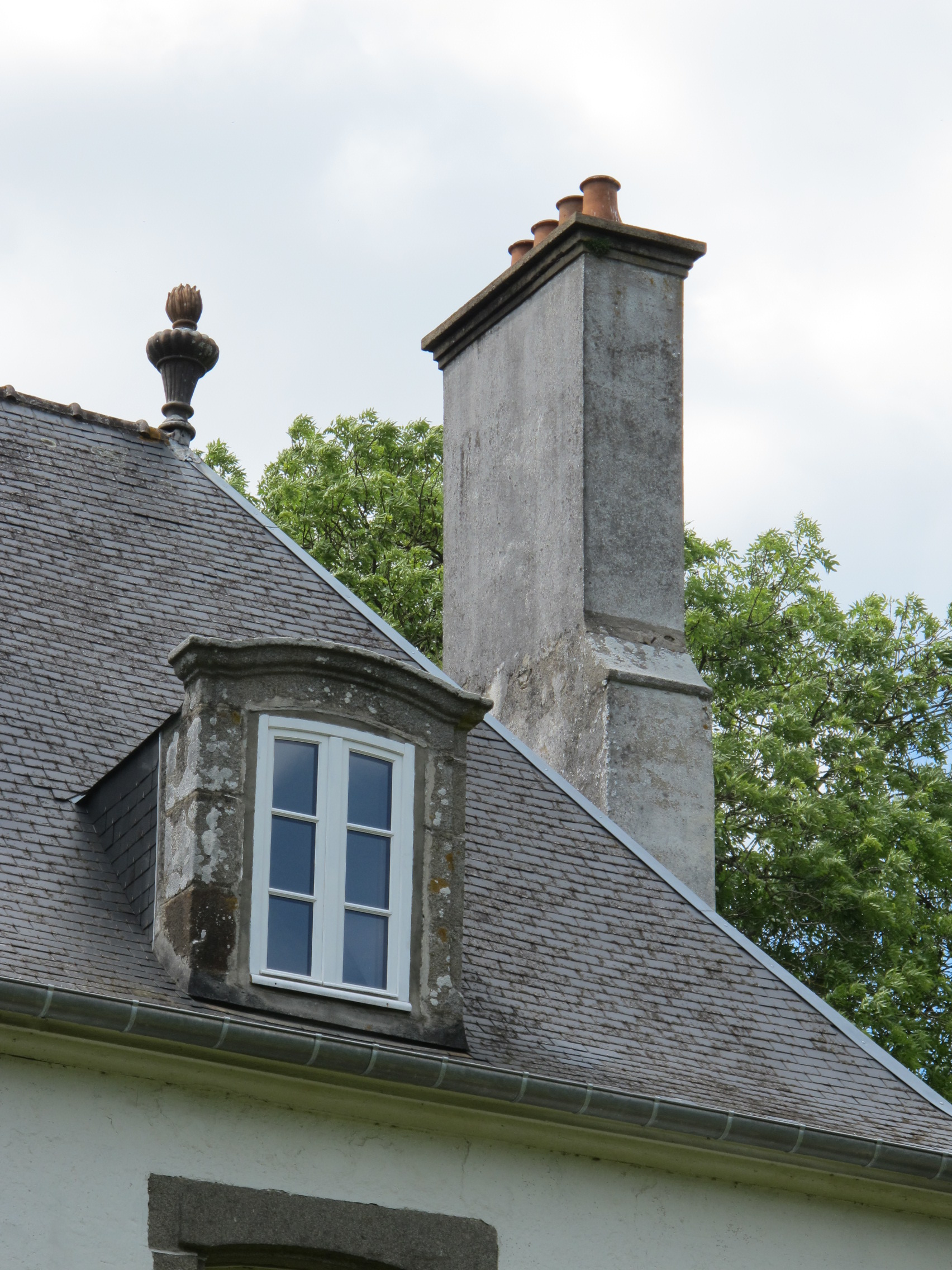 Détail : lucarne en arc segmentaire et cheminée à épaulement, typiques des "malouinières". Vue du jardin.Immatriculation