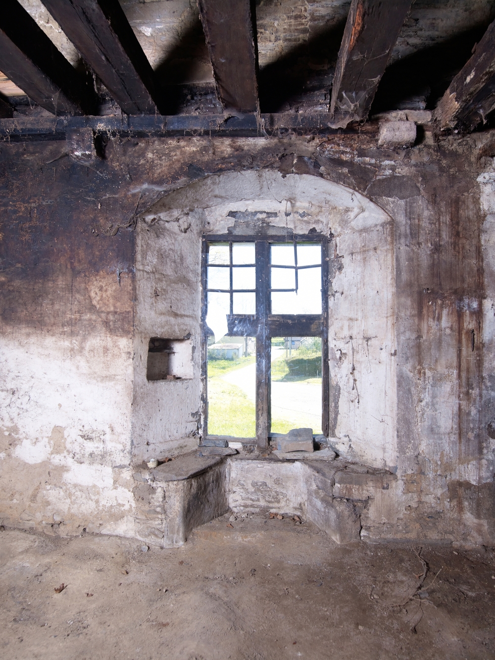 Manoir, rez-de-chaussée : la fenêtre à coussièges de la salle, sur le mur est (état en 2014)Immatriculation
