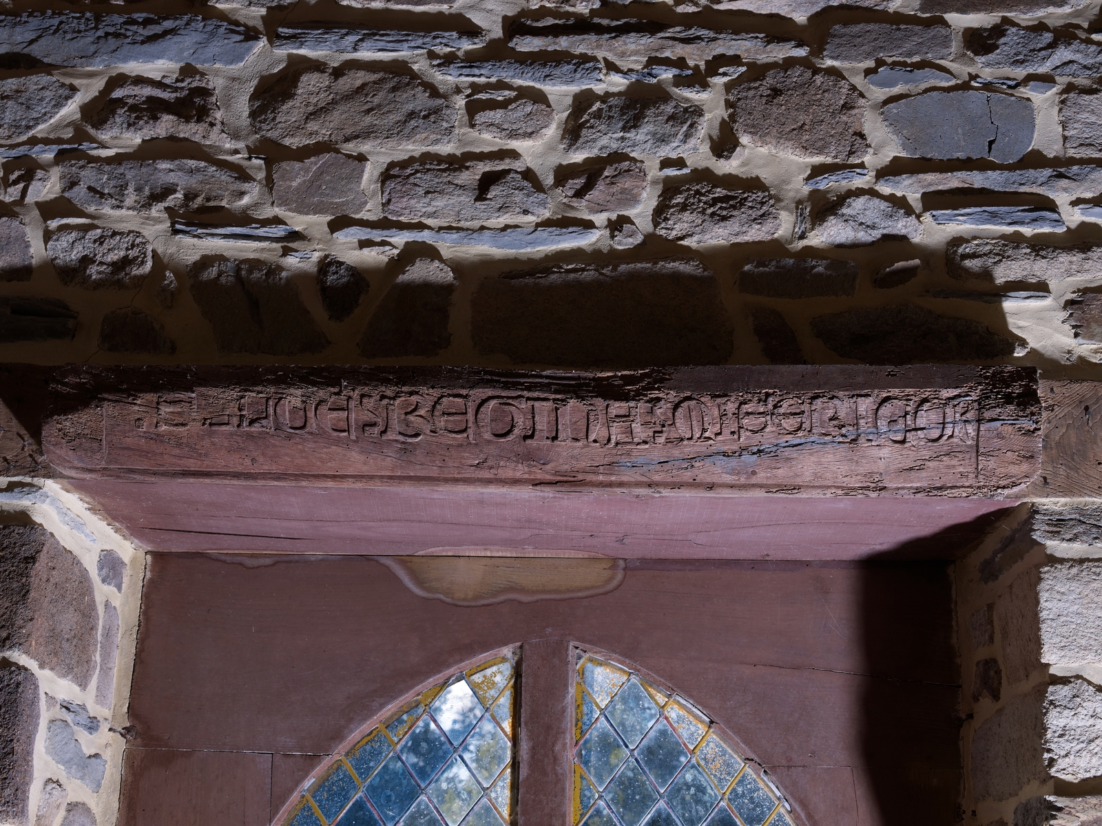 Intérieur, mur nord : sablière remployée comme linteau portant l'inscription partiellement lisible S [---] E : REGINA MISERICOR[…]Immatriculation