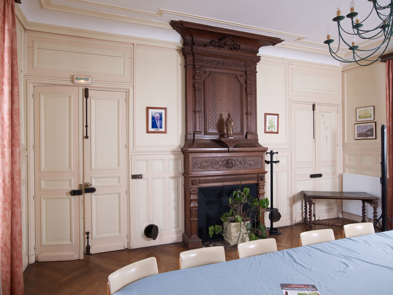 Rez de chaussée. Pièce à doite du hall d'entrée dite "Salle Saint-Yves" avec cheminée néo-Renaissance et clapets placés devant les bouches de chaleurImmatriculation