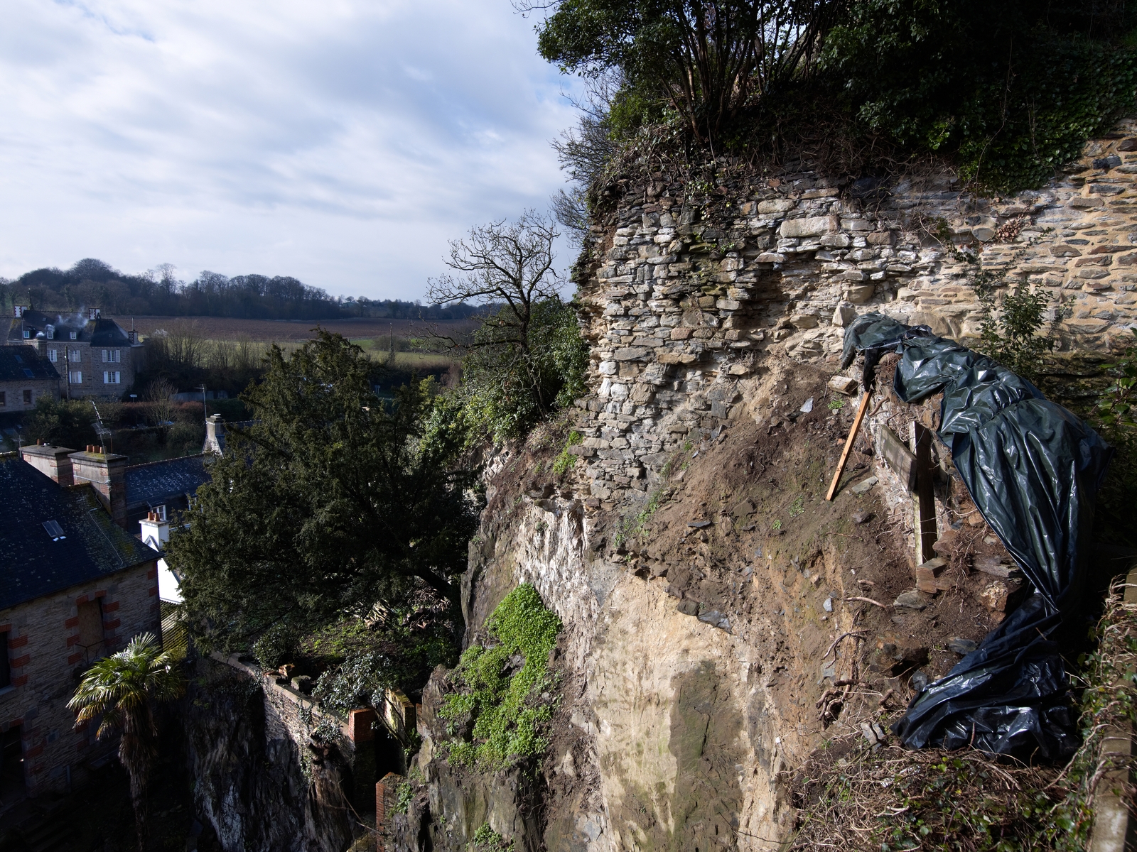 Eperon rocheux et vestige du mur d'enceinte de l'ancien château. Terrasse de jardin en contrebas. Vue sud-estImmatriculation