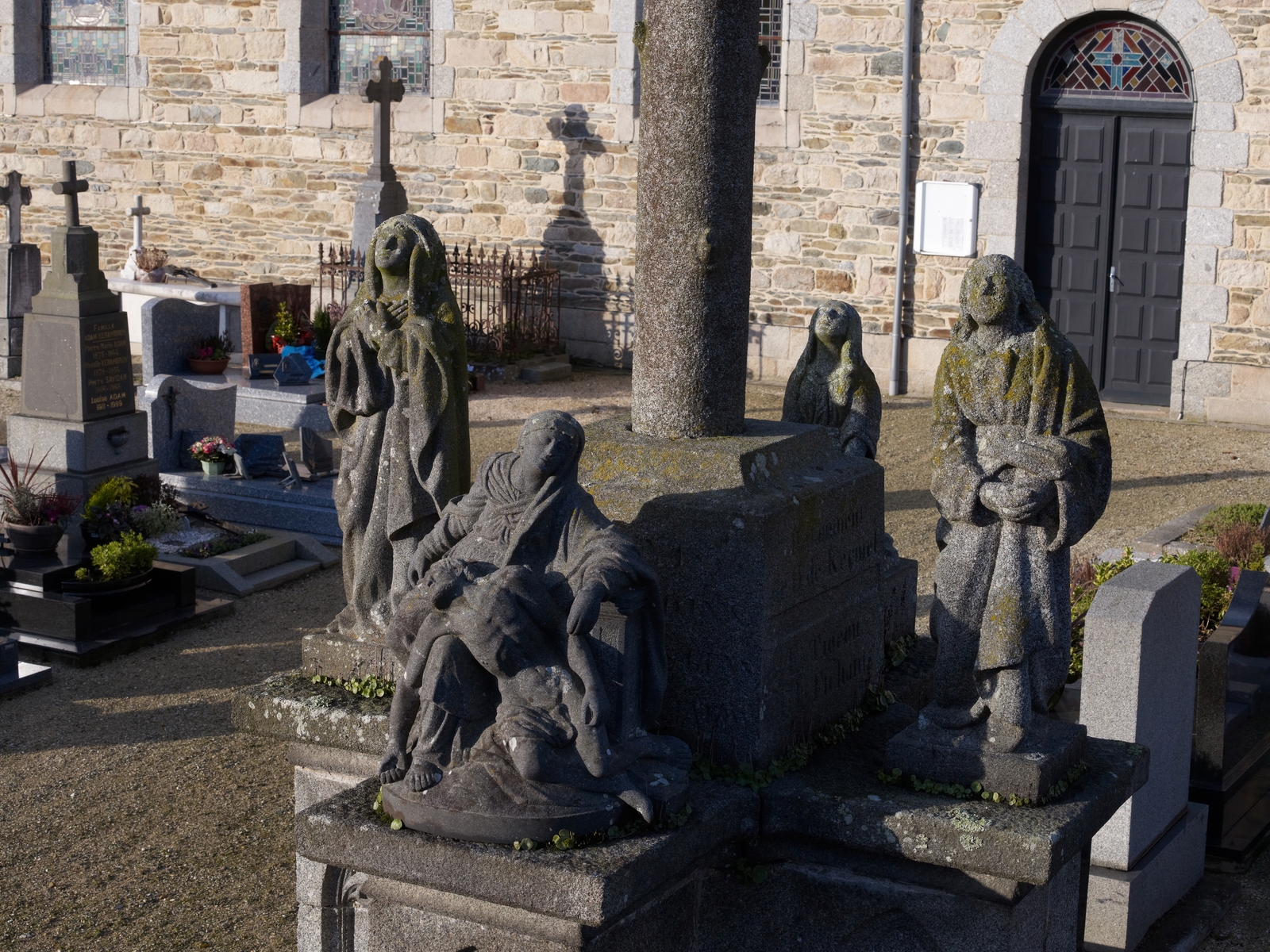 Calvaire de l'église paroissiale. Détail du socle avec statues de la Vierge, de saint Jean, de Marie-Madelaine et le groupe sculpté de la Vierge de PitiéImmatriculation