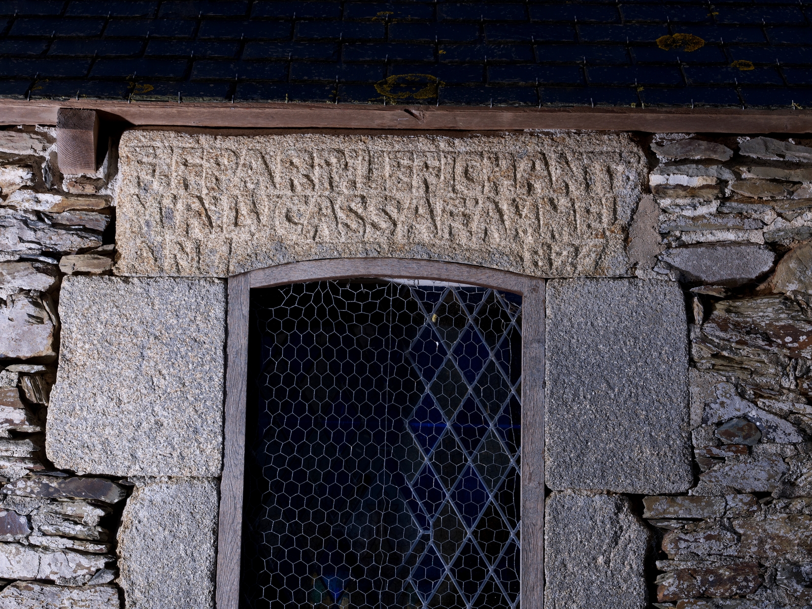 Chapelle du manoir. Façade sud. Détail d'un linteau sculpté d'une inscription : F:FPARP:LEFICHANT:M:A:LUCASSAFAMME AN 1827Immatriculation