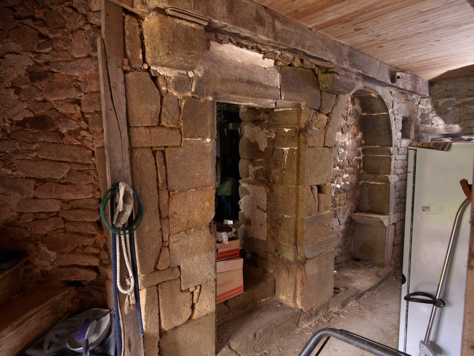 Mur de refend intérieur de la salle avec vaisselier mural, porte et escalier en visImmatriculation