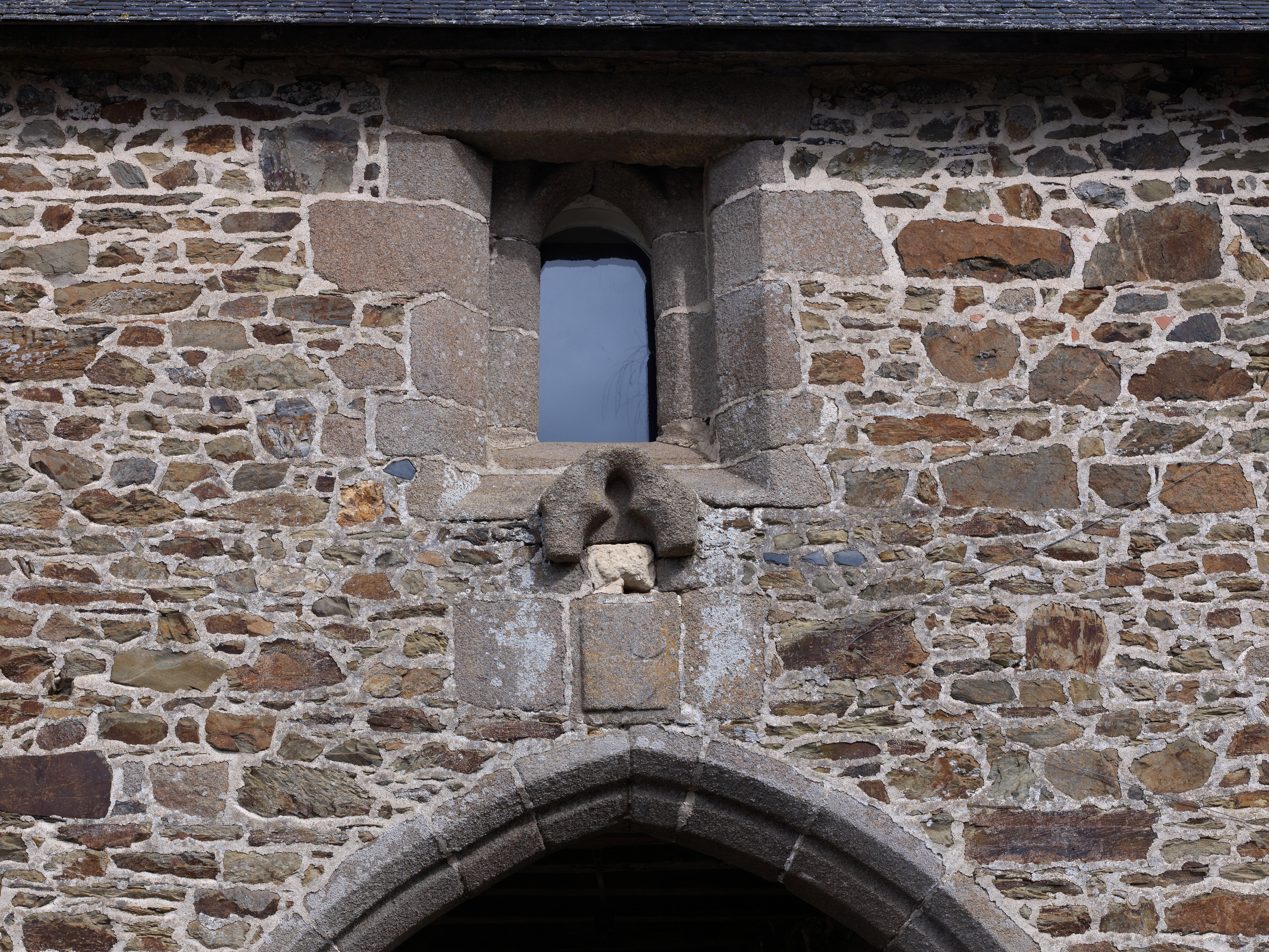 Manoir. Logis-porte. Détail de la fenêtre à double ébrasement et de la niche trilobée situées au dessus de la porteImmatriculation